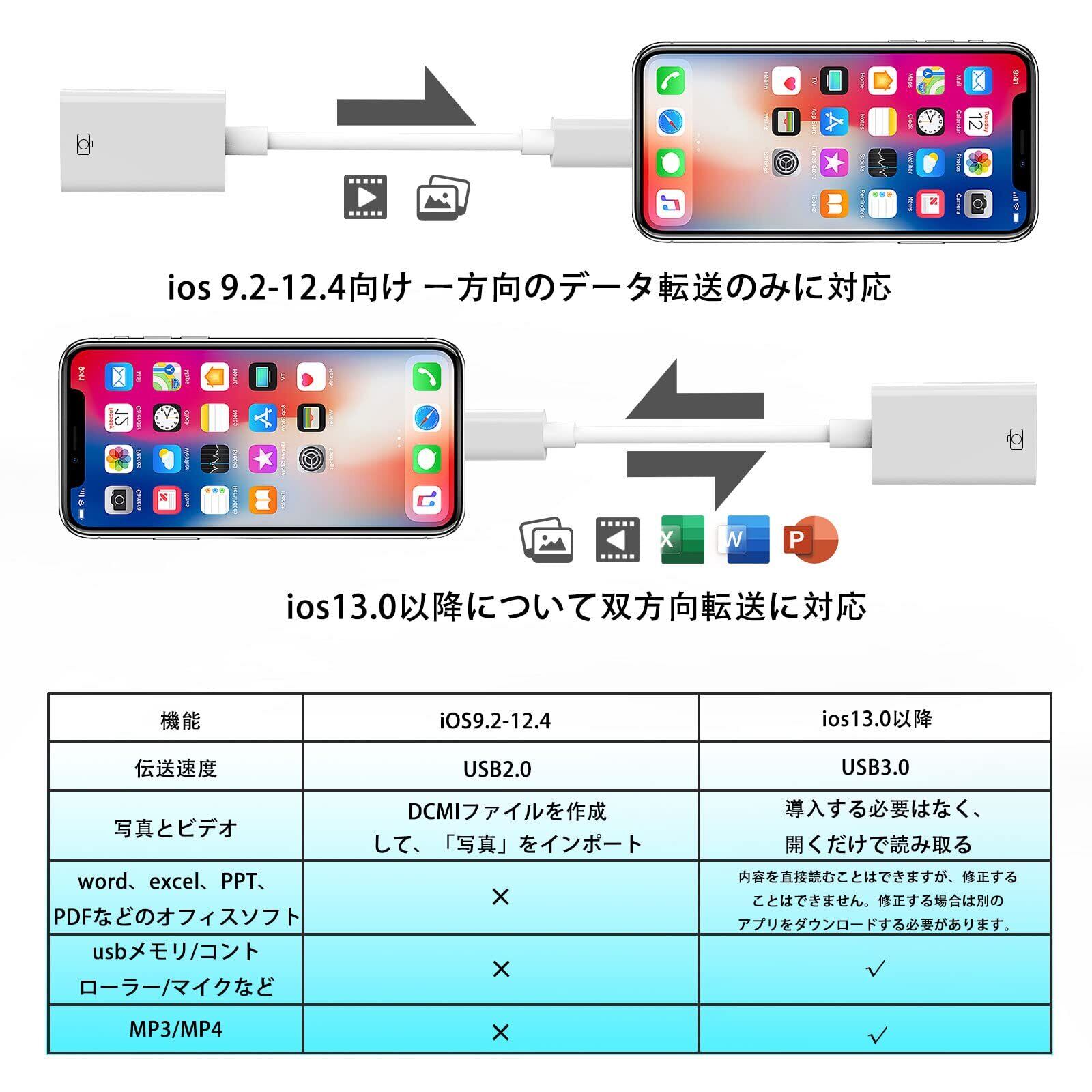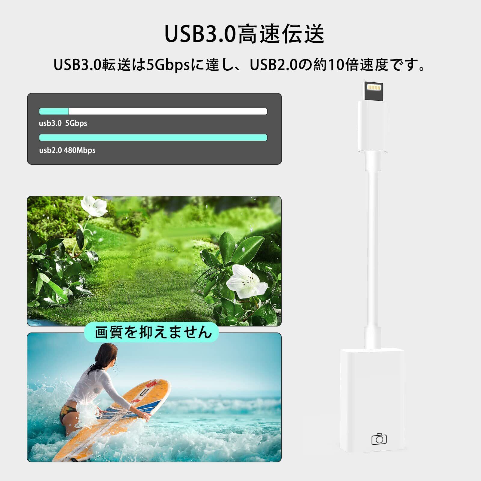 【双方向転送&USB3.0高速ポート】写真/音声/ファイルは双方向の送信と読み取りをサポートし、ユーザーがデータや情報を入力/エクスポートすることができ、USB3.0高速ポートを介して簡単にドライブと効率を大幅に向上させる。金メッキコネクターとマルチシールドの内部構造で、IOSデバイス間の写真やビデオの転送はより速く、より安定しています。