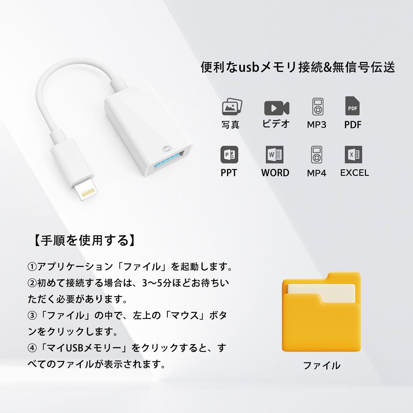 【プラグ&プレイ】使用簡単&面倒な設定は一切無し、iPhone/iPadに挿入するだけで、手軽に写真・動画を伝送できます。「確認」オプションをクリックします。 約10‐25秒後で自動的に完了する予定です。※ご注意:カメラが転送されている場合はDCMIファイルを使用し、カメラがない場合はパソコン経由でDCMIファイルを作成します。
