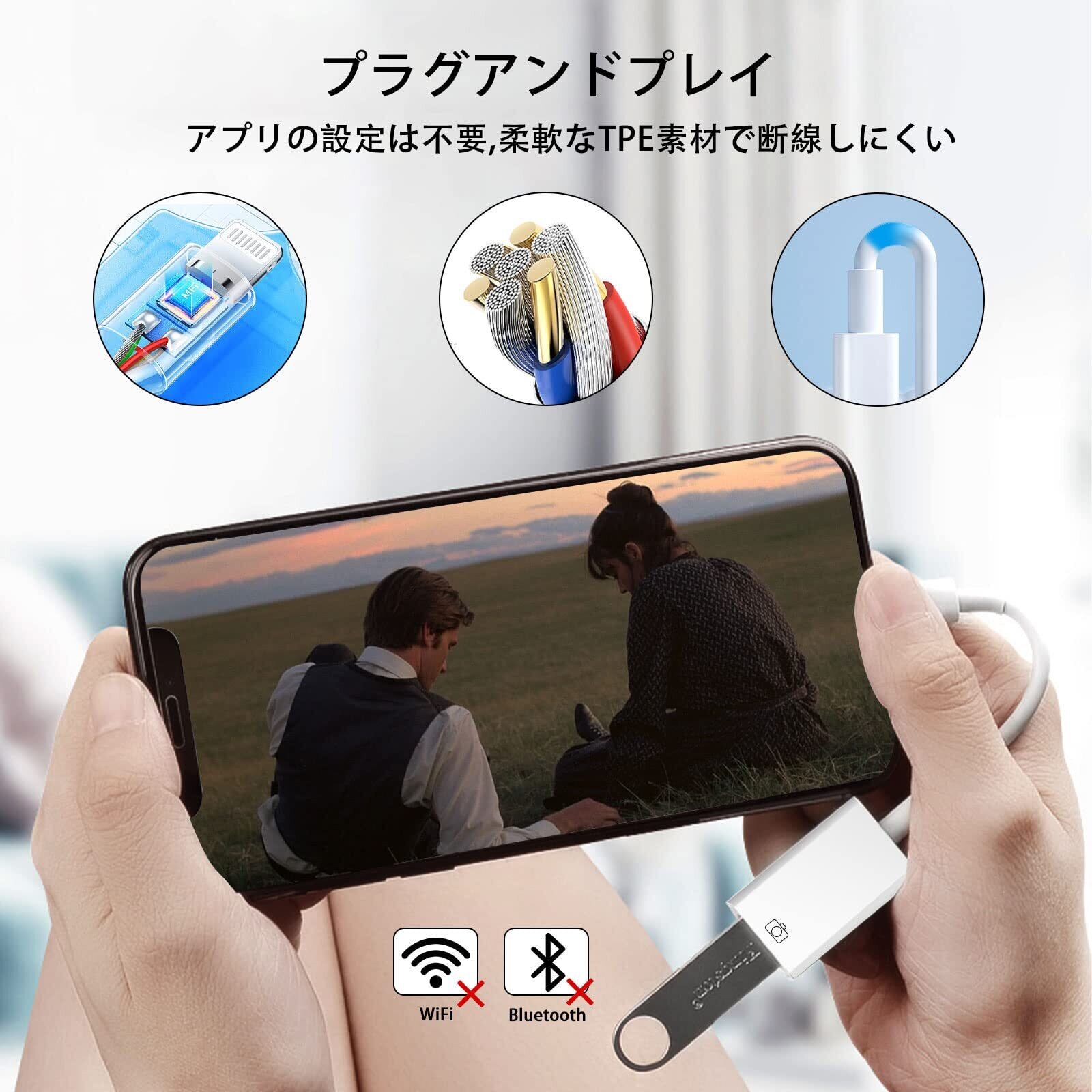 【MFi正規認証品】Apple MFi認証を受けているlightning usbカメラアダプタは写真、動画、音楽、ExcelやPDFなどのファイルデータを数秒内で高速データ転送と読み取ることができます。小型で持ち運びしやすく、コンセントは合金製、コード部は高純度銅芯線製で、柔らかいTPE素材で補完し、従来よりも強度を高めています。長時間の使用でもプラグが緩むことはありません。