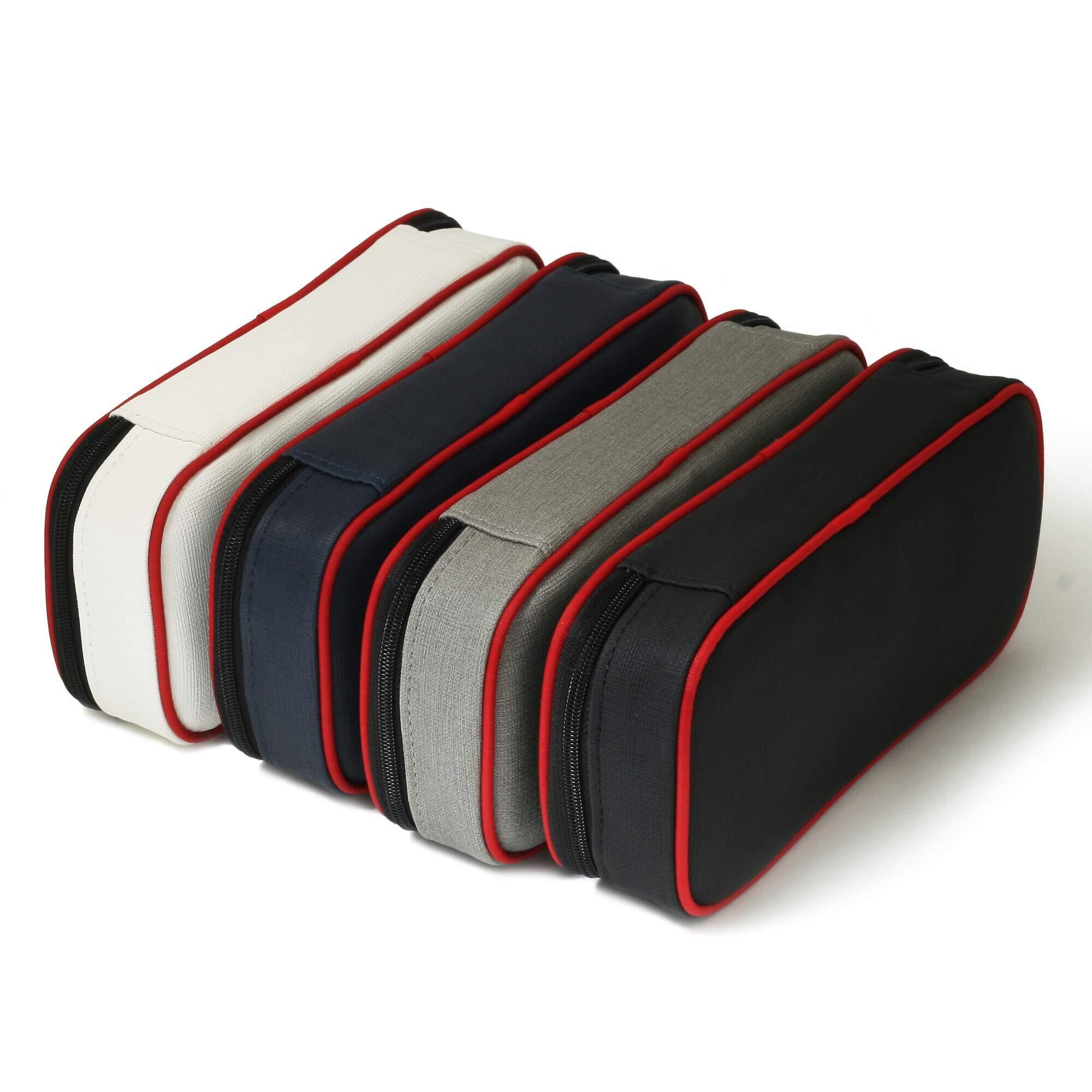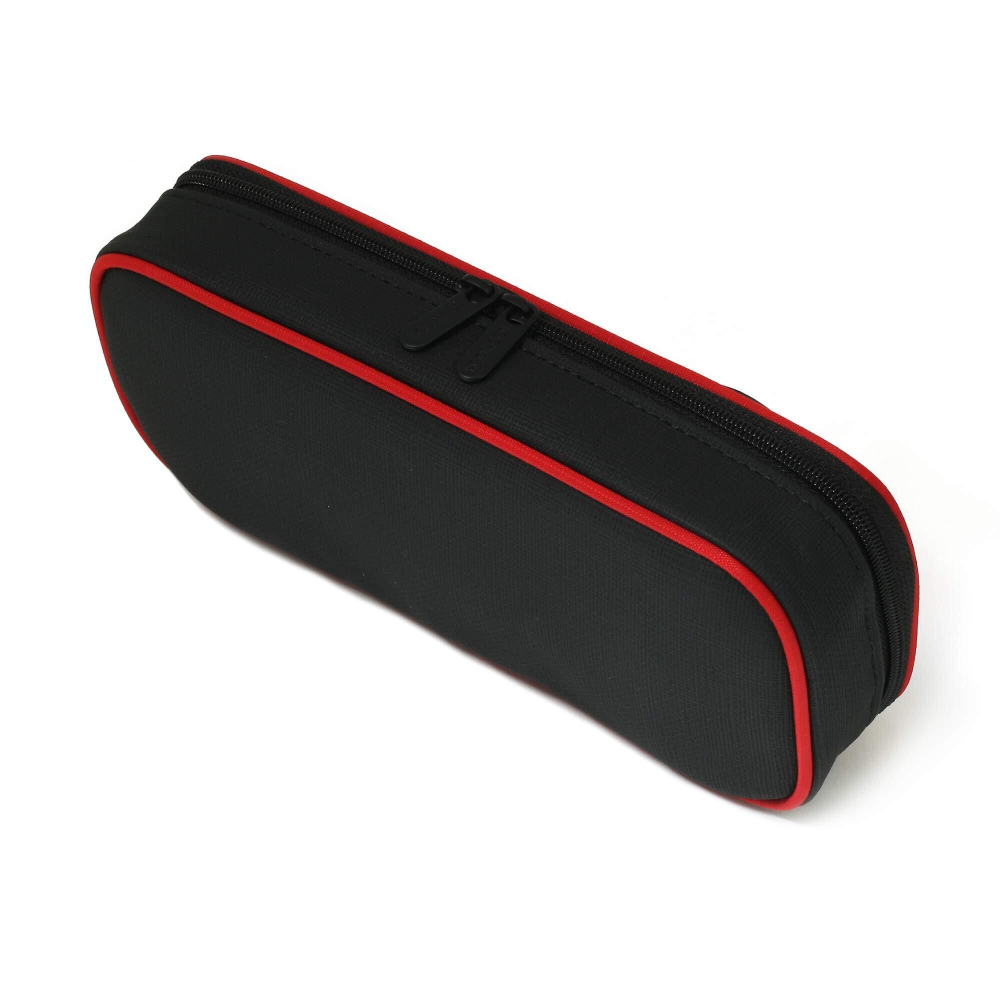 シンプルでおしゃれなデザイン、赤いパイピングと斜めロゴがポイント。全方位クッション内蔵で衝撃に強く、中身をしっかり保護。