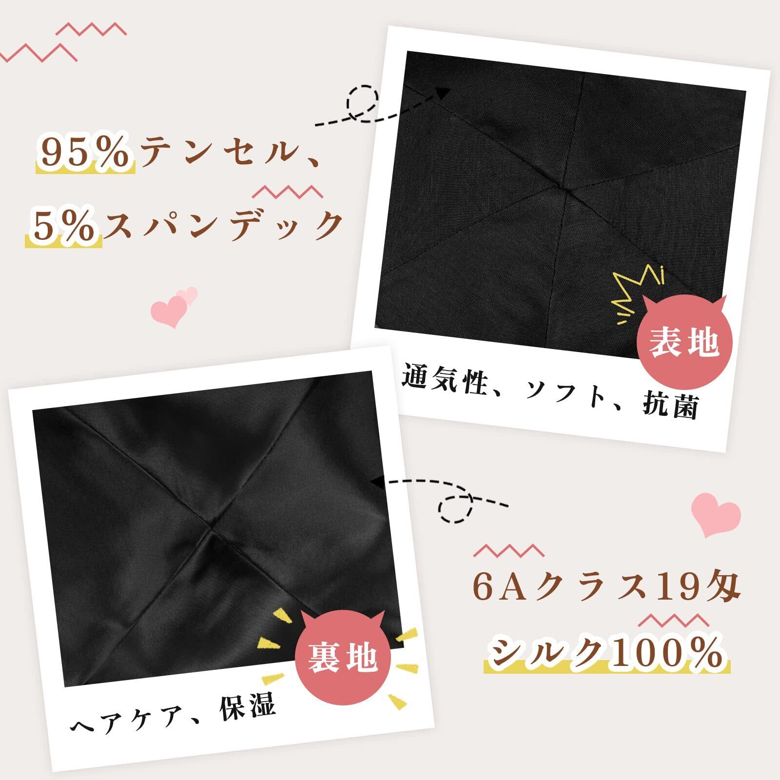【独特なデザイン】裏地:6Aクラス19匁シルク100% 表地:95%テンセル(レーヨン) 5%スパンデック(ポリウレタン) 外側の生地は通気性が良くて、伸縮性が高く、自由に折りたたむことができます。裏地のシルクは保湿力があり、頭皮の乾燥やパサつきがちな髪の毛に良いです。朝のスタイリングが楽になります。