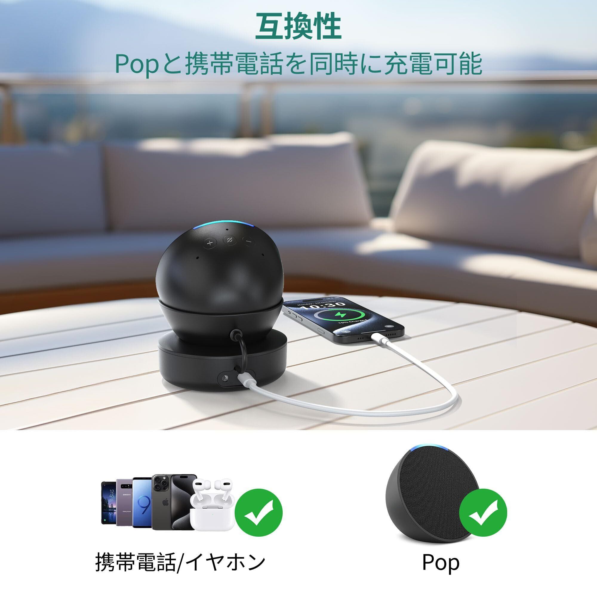 互換性:このバッテリーベースは、Pop およびスマートフォン、イヤホン、スマートウォッチ、タブレットなどのUSB電源対応デバイスに対応しています。背面にはUSB-Cポートが装備されています。入力ポートには必ずPop純正アダプターをご使用ください。(注:本製品にはバッテリーベースのみが含まれており、デバイスは付属しておりません。)