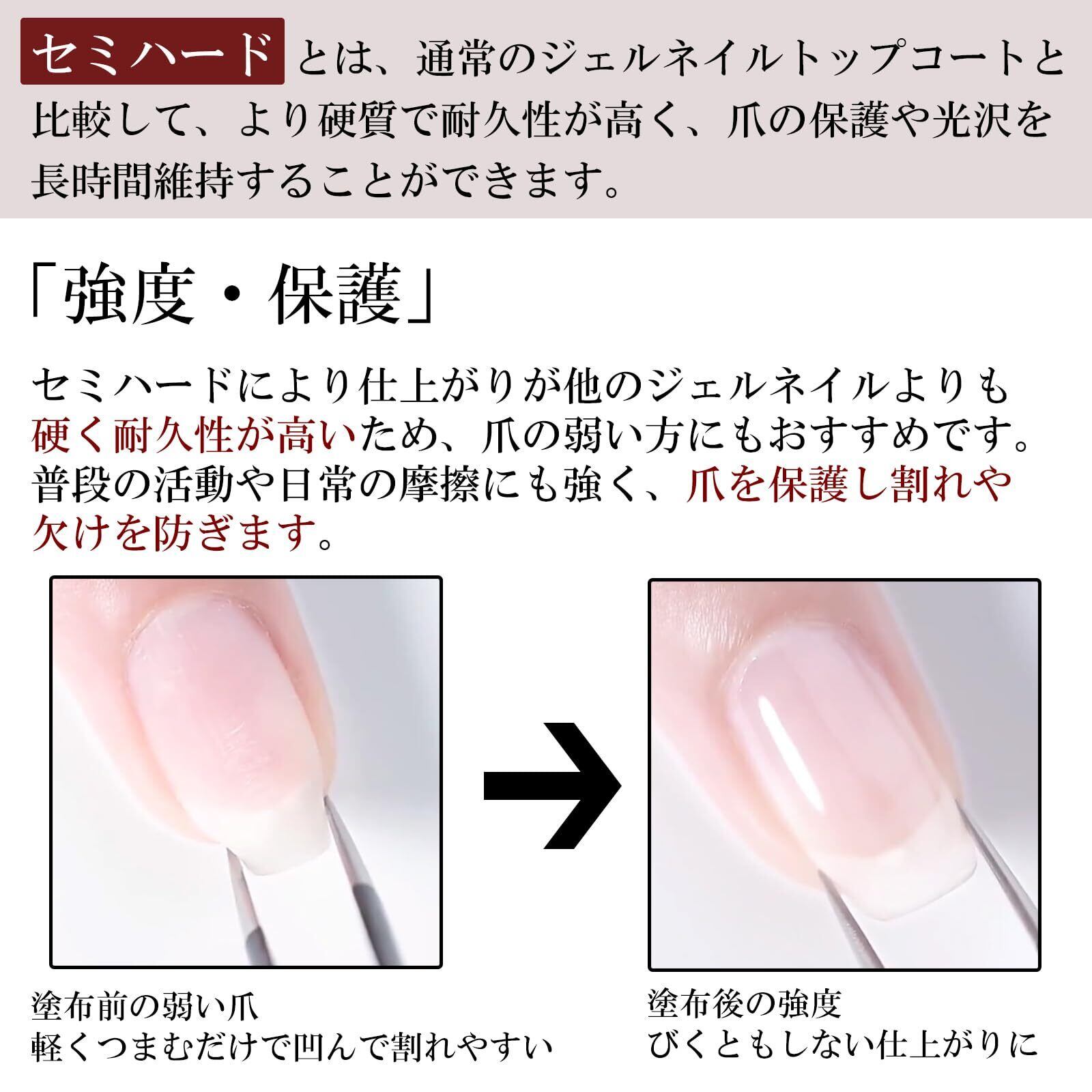 【LULUGEL セミハード トップジェル】内容量:15ml 硬化時間:【LED】約30~120秒 【UV】約120~180秒 ※塗量や色によって硬化時間が異なる場合がございます。