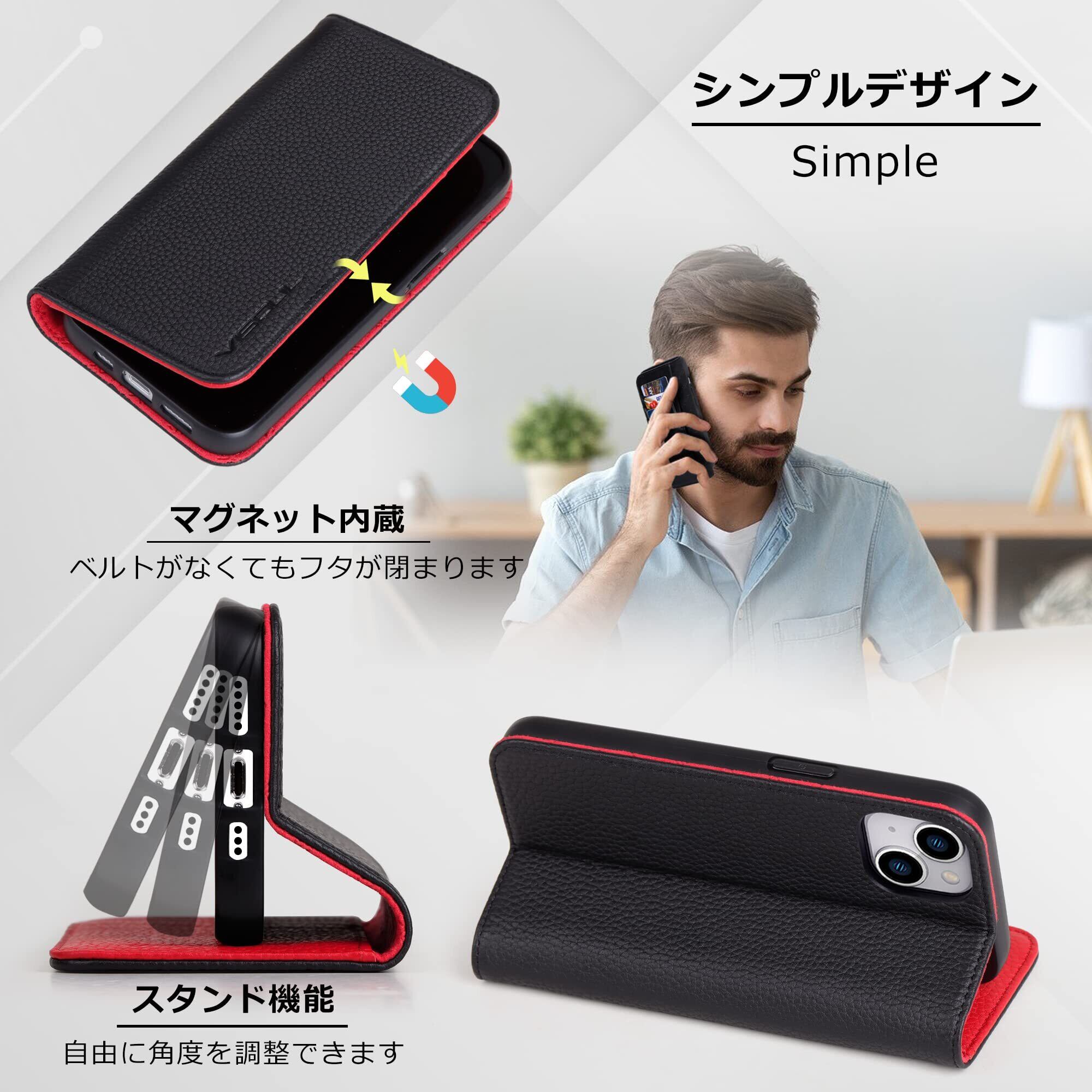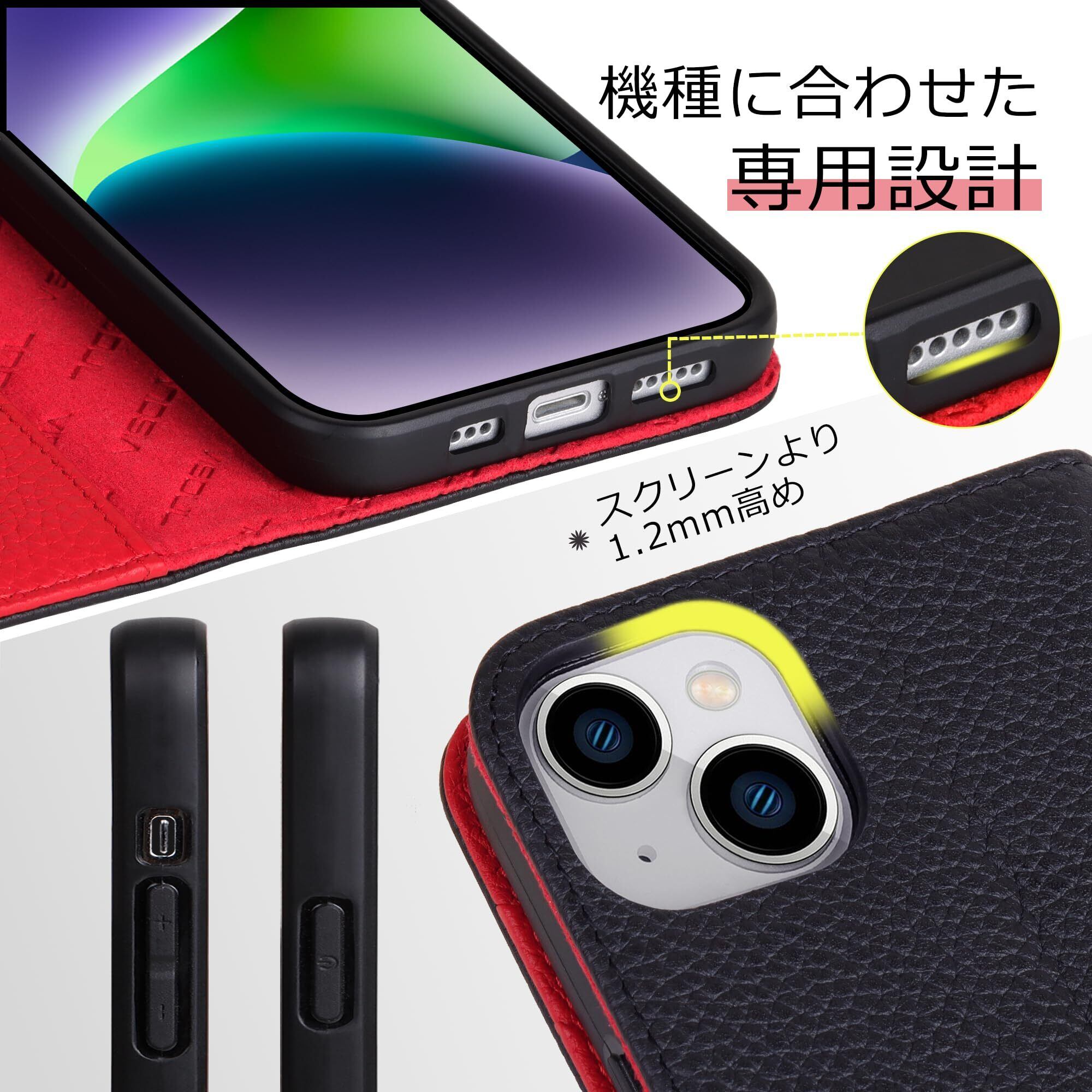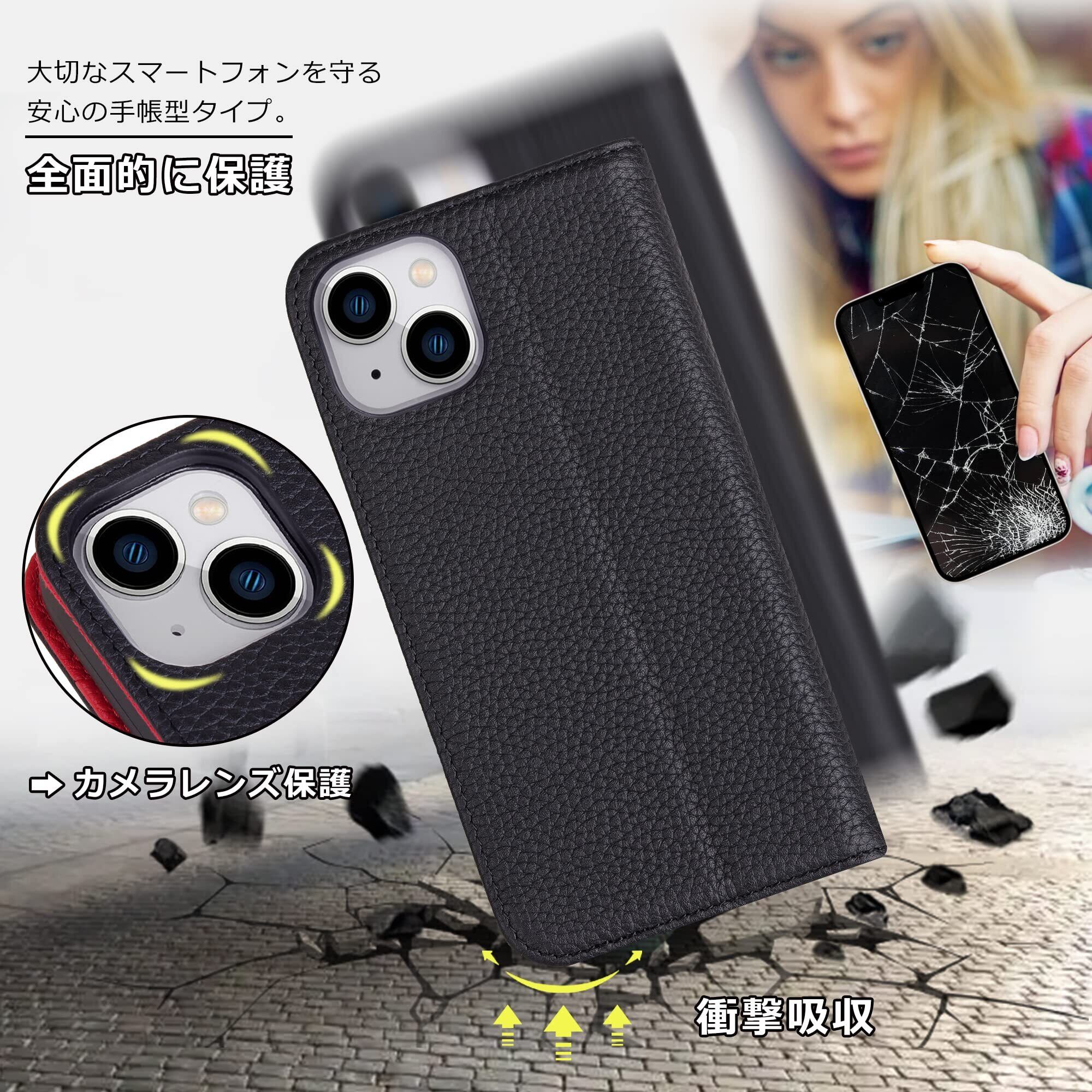 iPhone15対応・本革素材手帳型ケース:背面だけでなく、画面を覆っているため、画面から直接地面に落ちる場合は、スマホの画面を保護してくれるので安心といったイメージがあります。カバーの面積が広くなり、カバーの外側や内側を有効利用できる点も手帳型の魅力の1つでしょう。カバーの内側にポケットがあり、カード型のものを収納しておけます。定期やクレジットカードといったものは、生活する上で頻繁に使います。