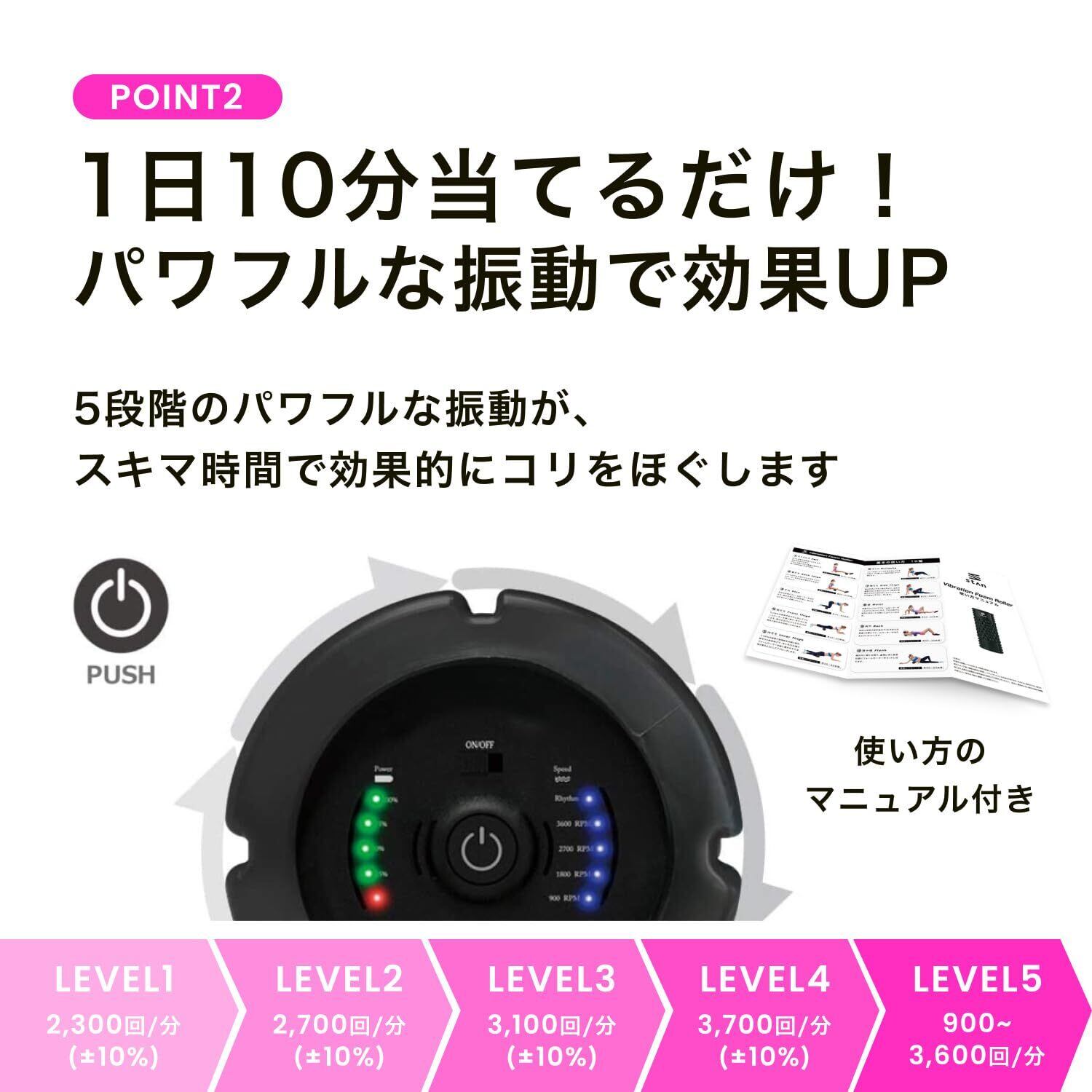 【 5段階のパワフルな振動 】stanフォームローラーはただのフォームローラーとしてのご使用はもちろん、振動させて使用することで、より効果的なストレッチにつながります。振動も5段階に分かれているので、部位や個々の柔軟性によって振動を使い分けることで効率よく筋膜リリースなどのセルフケアを行うことができます。