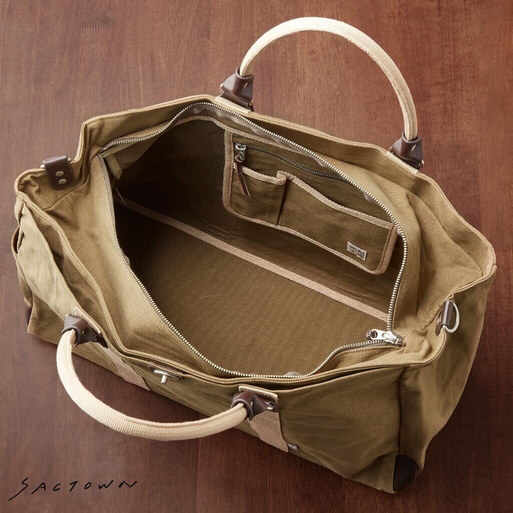 耐久性のある帆布生地とレザーの組み合わせで、ナチュラルでぬくもりのある雰囲気の旅行バッグです
