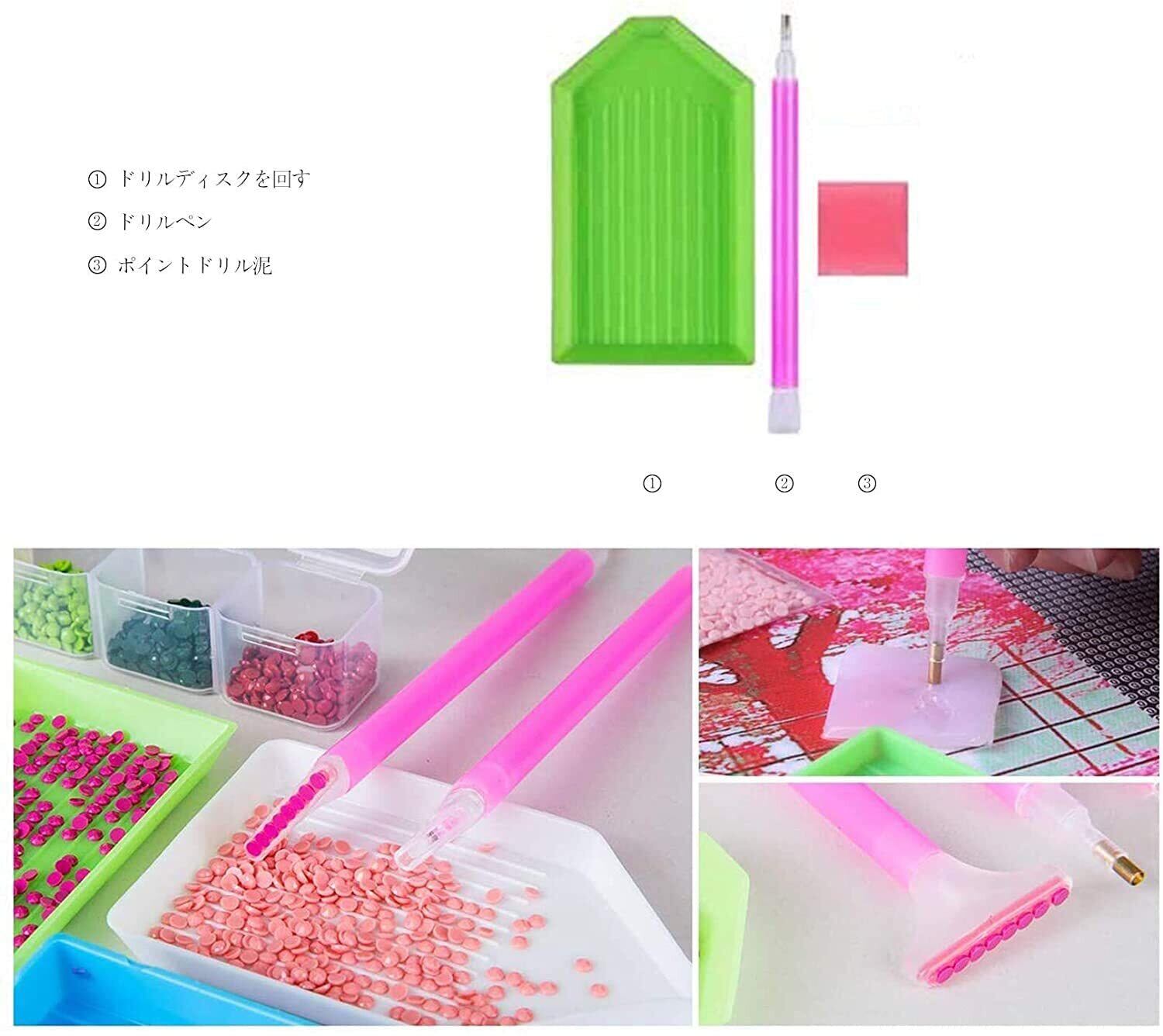 パッケージに含まれるもの:キャンバス、丸ビーズ、1 x ダイヤモンドペン、1 x ビーズのトレー、1 x ピンクのグルー