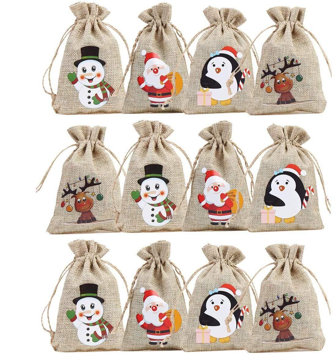 CCINEE ギフトバッグ クリスマス ラッピング袋 巾着袋 4柄x3枚 12枚セット 小 麻素材 リネン サンタさん 雪だるま トナカイ ペンギン プレゼント入れ 小物入れ 収納袋 ジュエリーポーチ (4種類の柄)
