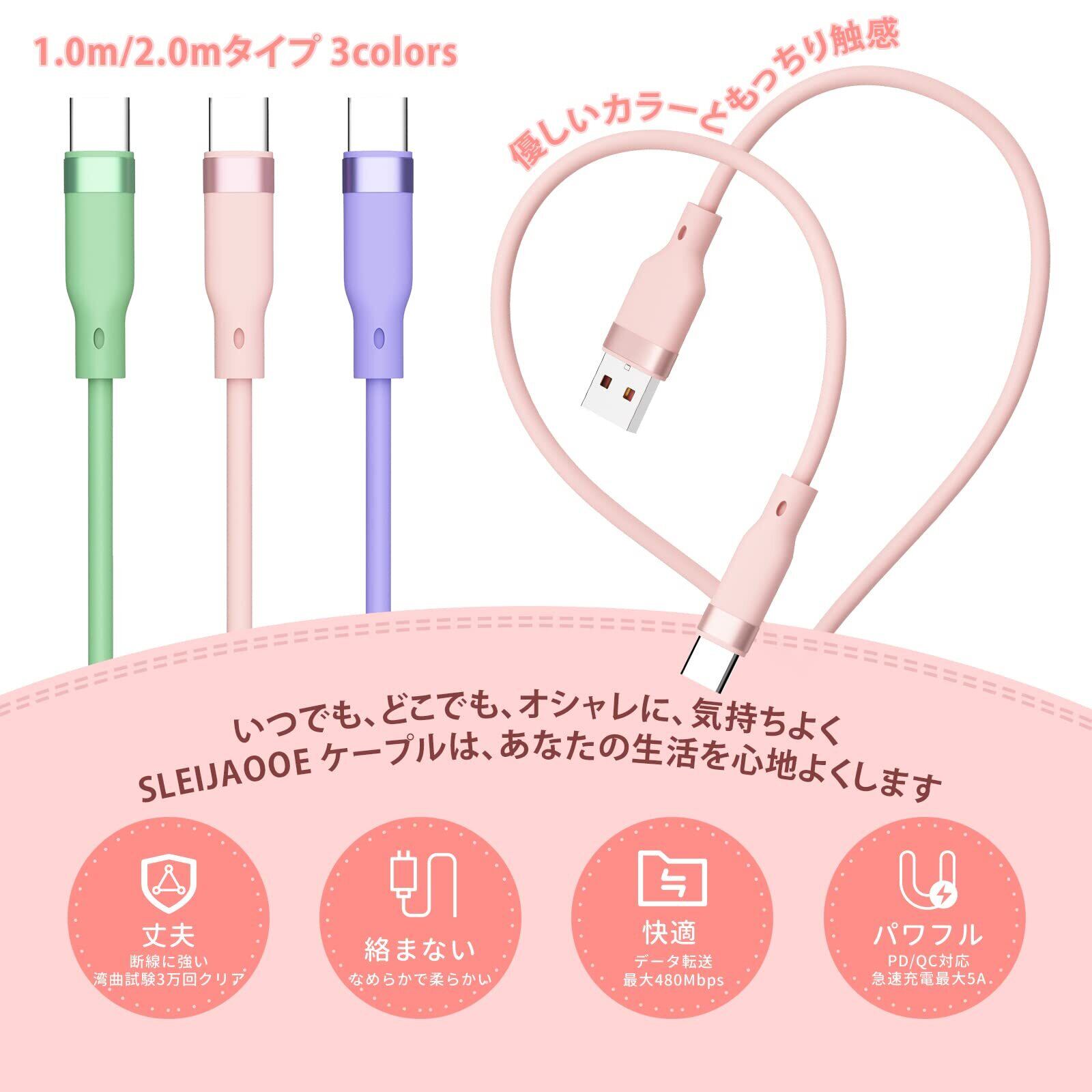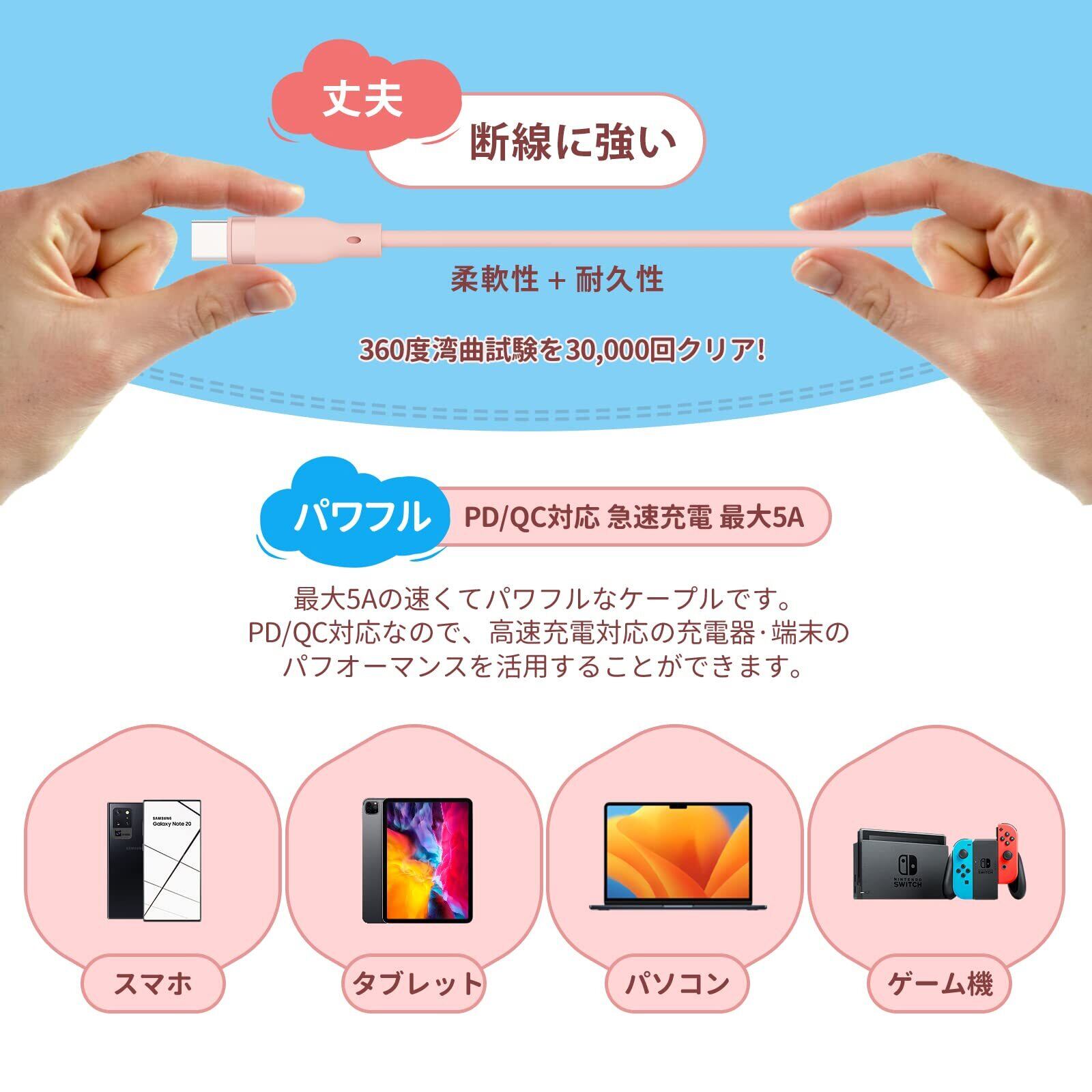 【ケーブル仕様】PD)/QC対応 最大3A / USB2.0 データ転送 最大480Mbps / 湾曲試験30,000回クリアで断線に強い / やわらかシリコン素材で絡みにくい。