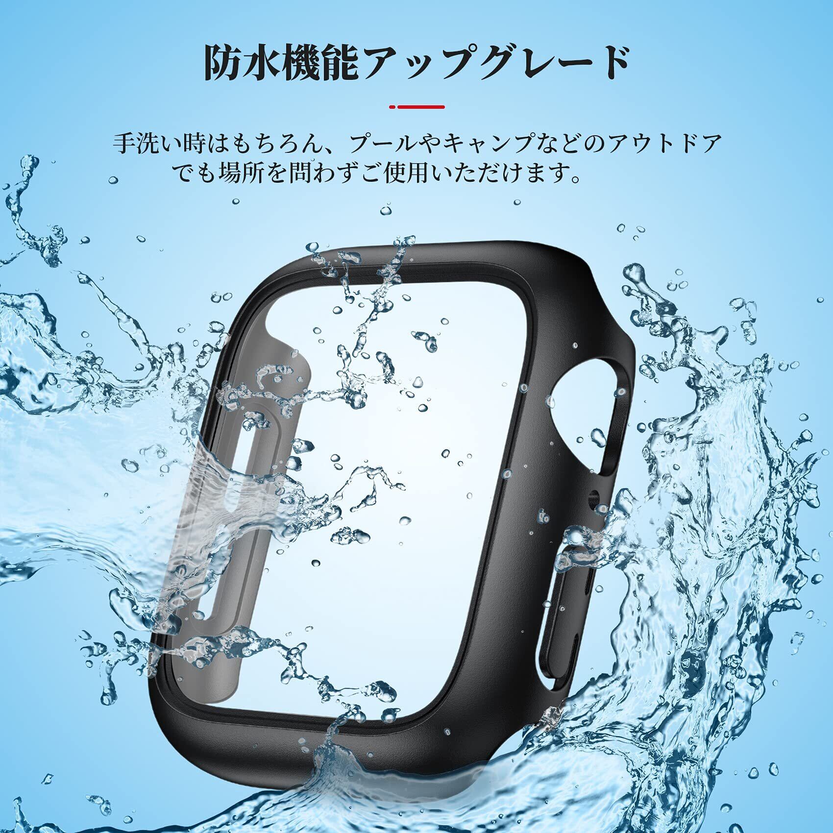 【防水仕様】 今までのアップルウォッチケースを基に改良し、防水機能が向上しました。水深1.2mの水に35分浸すテストでケースの防水効果が最大IP68になります。抜群の防水能力で、アップルウォッチ液晶部と保護ケースの間に水が入り込む心配がございません。手洗い時はもちろん、プールでのワークアウトやキャンプなどのアウトドアでも場所を問わずご使用いただけます。(注意:Apple Watch本来の防水性能を向上させるものではありません。プールや海などの水場でのご使用時はアップルウォッチの説明に従い、スキューバダイビング、ウォータースキーなど、水圧が高くなったり、所定の水深より深く潜るようなアクティビティはしないでください。)