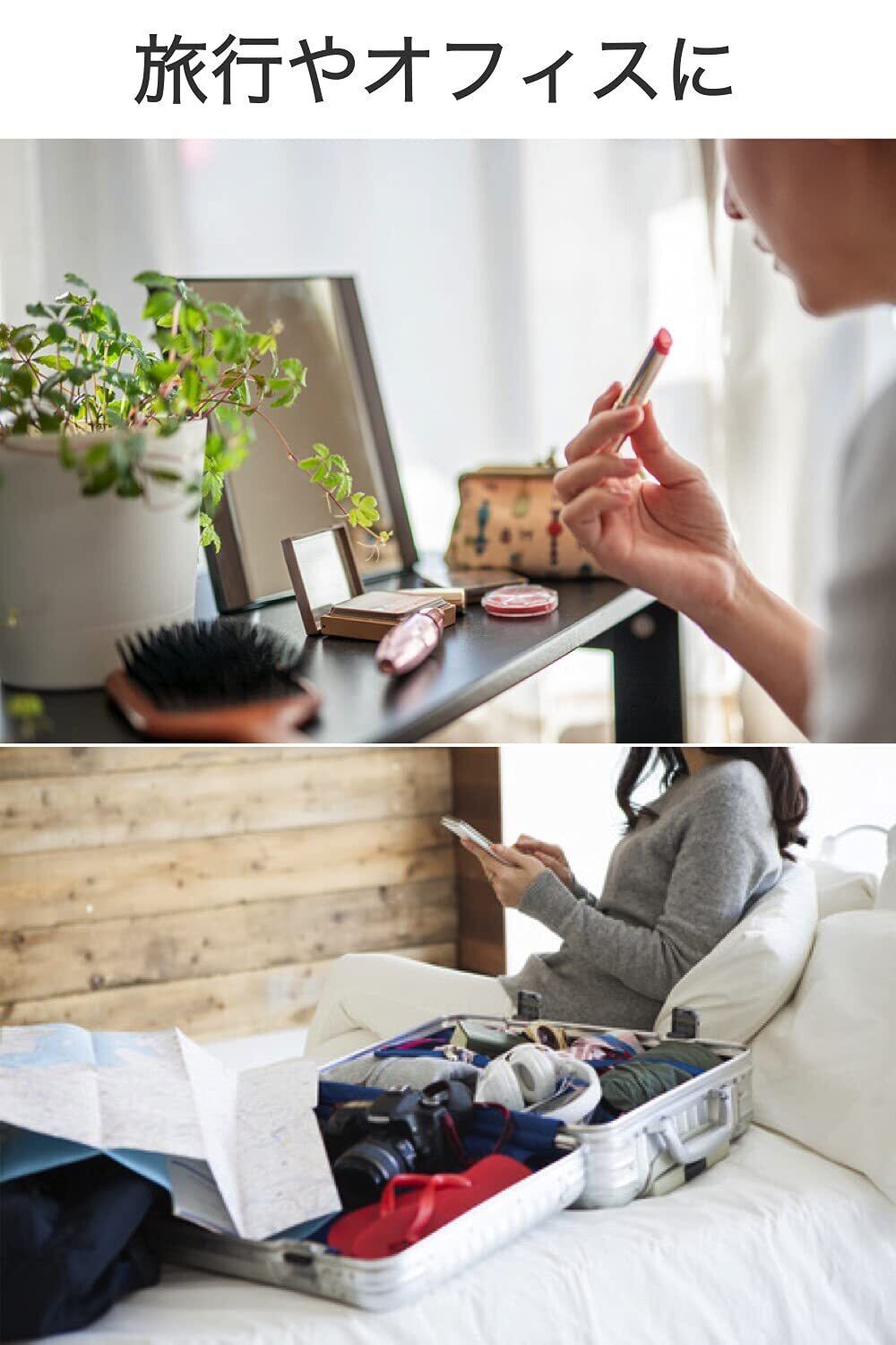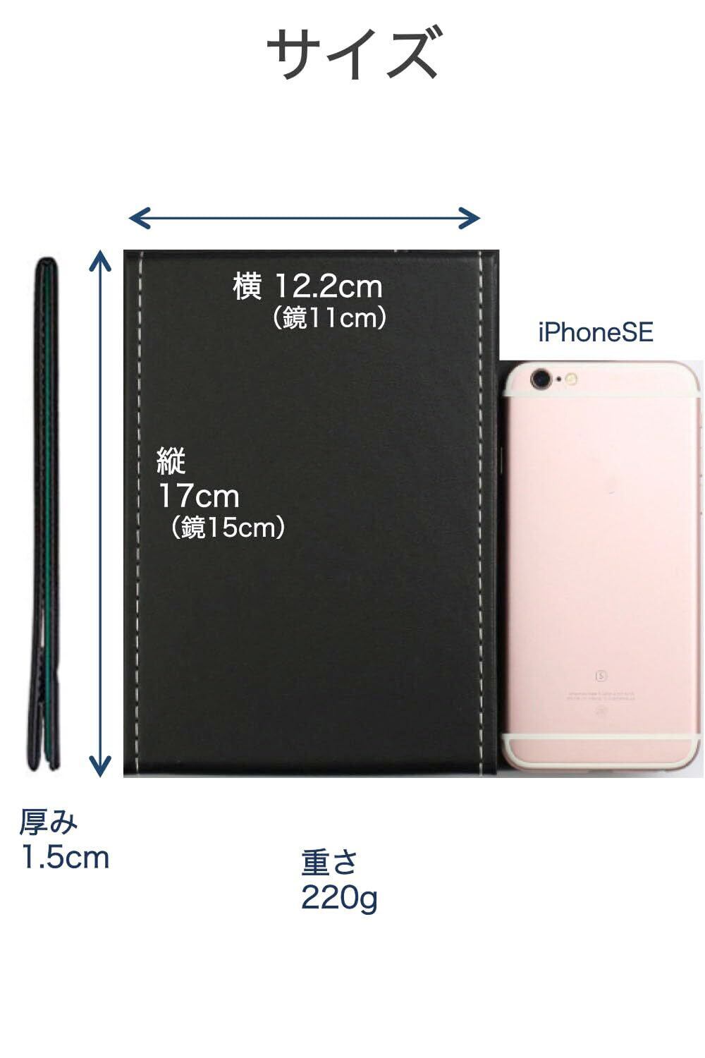 鏡サイズ 15 x 11cm のコンパクトミラー 適度な大きさと重さ(220g)で携帯に便利 レザー部分がクッションになるので安心 角度の調整はできません