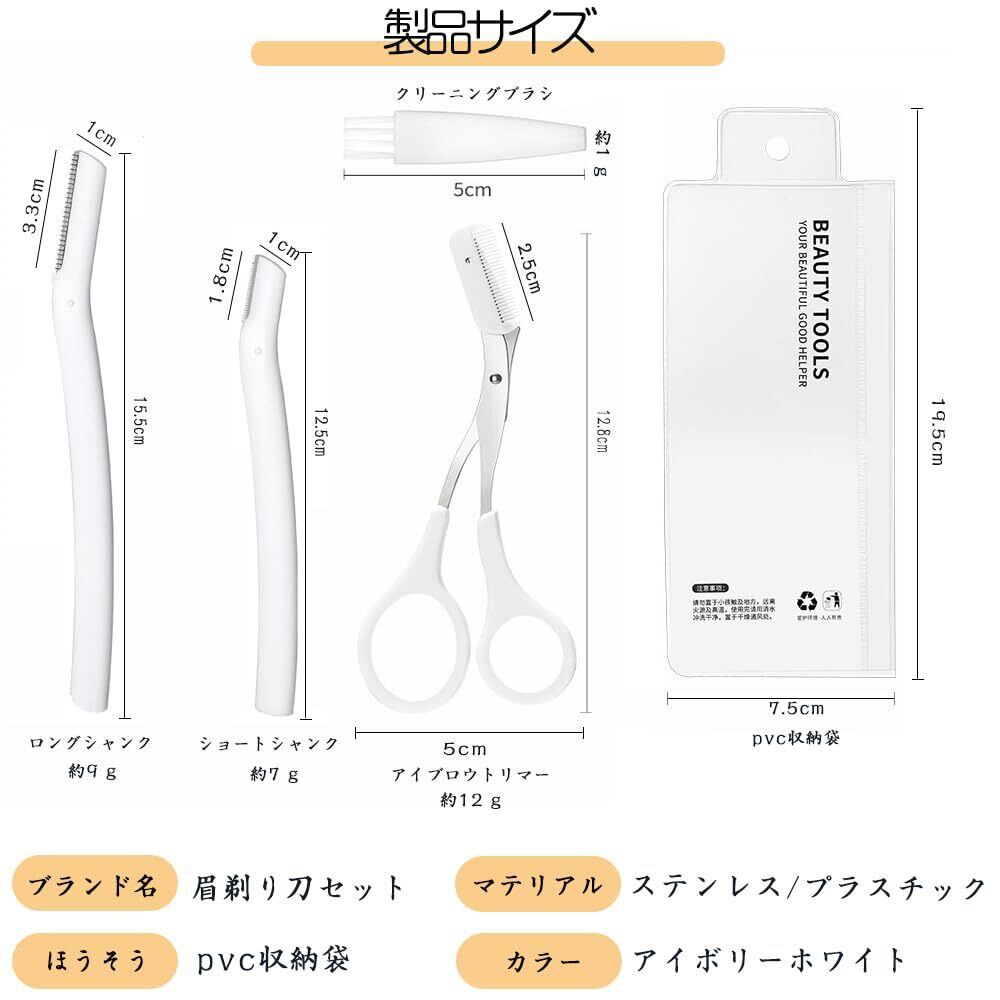 内容:コーム付きアイブロウカッター1本、ホワイトロングハンドル1本、ホワイトショートハンドル1本、収納バッグ、クリーニングブラシ、5点セット。