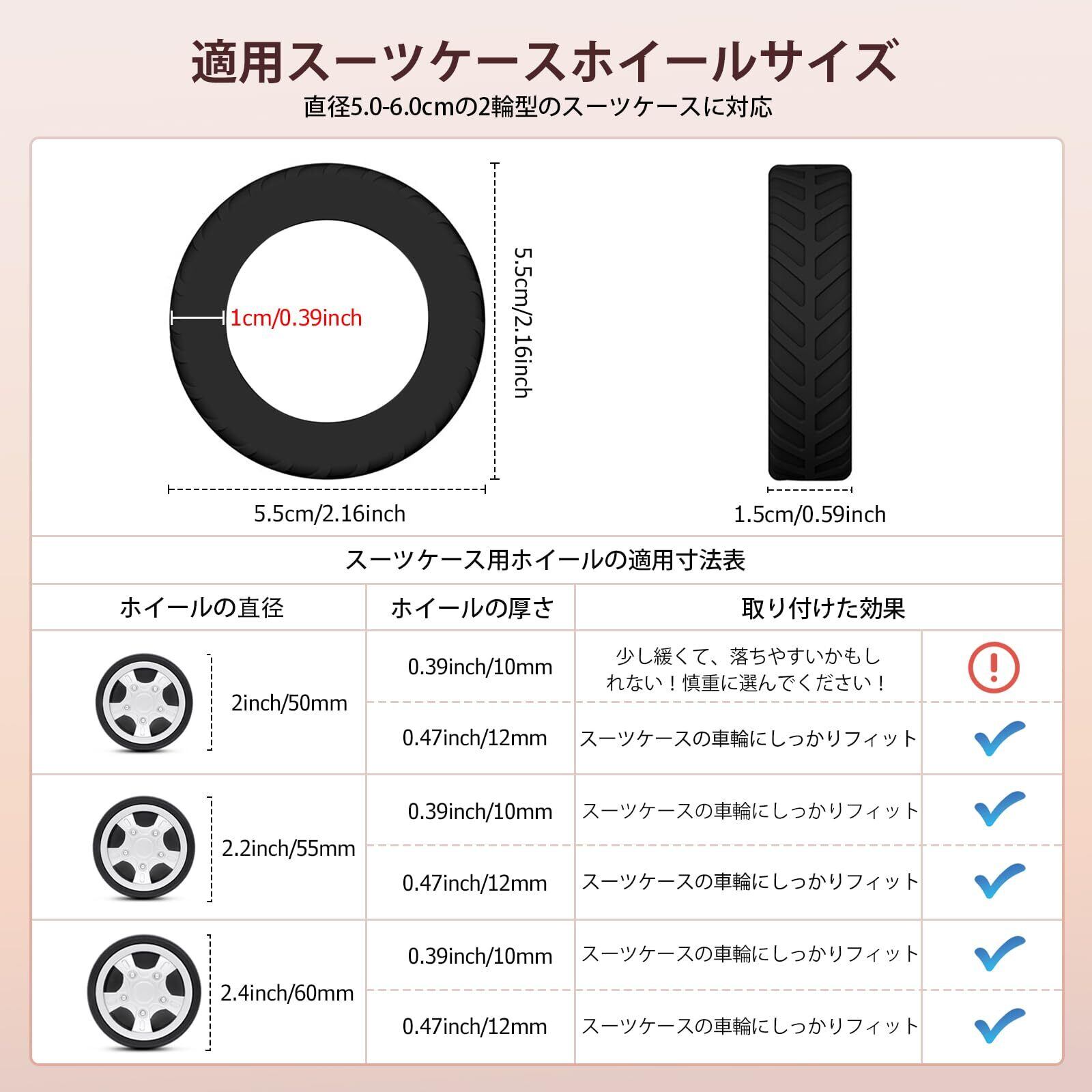 5-6センチ 8輪スーツケース用: このレベル 8 旅行用ケース ホイールプロテクターは、5〜6センチの車輪の直径を持つラゲッジに適しており、ラゲッジのホイールとホイール ベースフェンダーの間の距離は1.8ミリ以上である必要があり、ラゲッジのホイールと車軸の間の距離は1.2ミリ以上である必要があります。