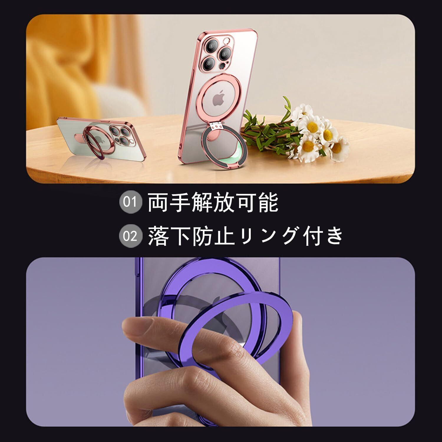 【リング付き 両手解放】:スタンド機能があるとドラマ、動画を見るのがとても便利、両手解放できます。リングを引き上げて指を通せば落下防止になり、片手でも安定した操作も可能に。また、左下にはストラップホールがあり、お好きなストラップを付けられます。