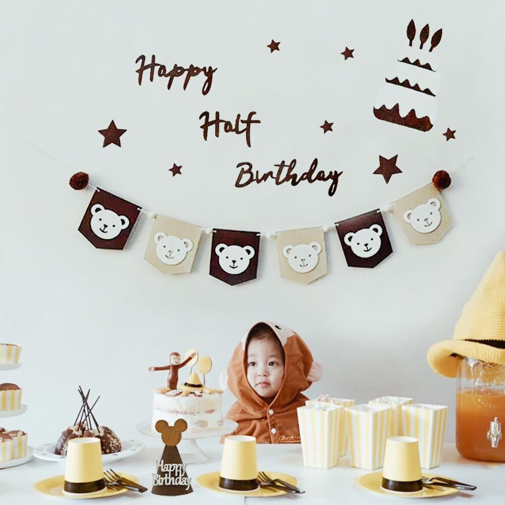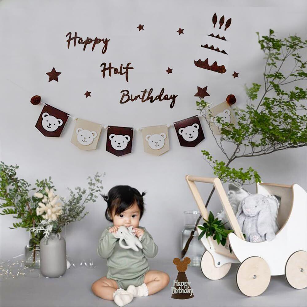 【在庫セール】ハーフバースデー 誕生日 飾り 可愛い 1/2歳 誕生日 飾り付け セット 女の子 男の子 高級生地 壁に飾る用のhappy half birthdayフェルト生地バナー、かわいいクマのフェルト生地フラッグガーランド、ケーキ、パーティー帽子、フグボールガーランド、 バースデー 飾り 大人 写真背景 子供 飾り お祝い Half Birthday Party Decorations | gsmshop
