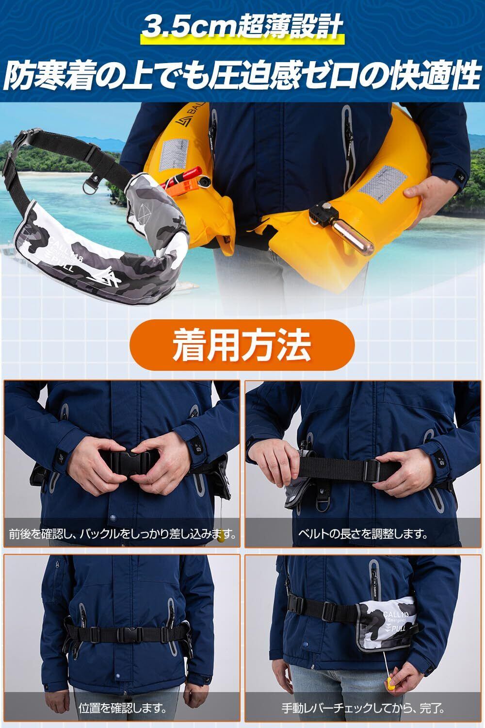 様々な方に適用 ライフジャケットのベルトはお好みによって自由に伸縮することができるので、どんな年齢層な方、男女兼用です!更に冬の季節で厚いコートを着用しても問題がありません。ライフジャケットの浮力は約11.7kgがあり(体重110kgの方まで適用)、 ウェストサイズが65~110cmまで調整可能です。