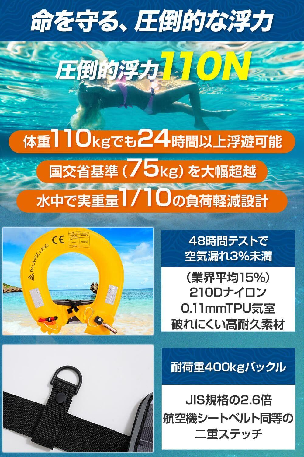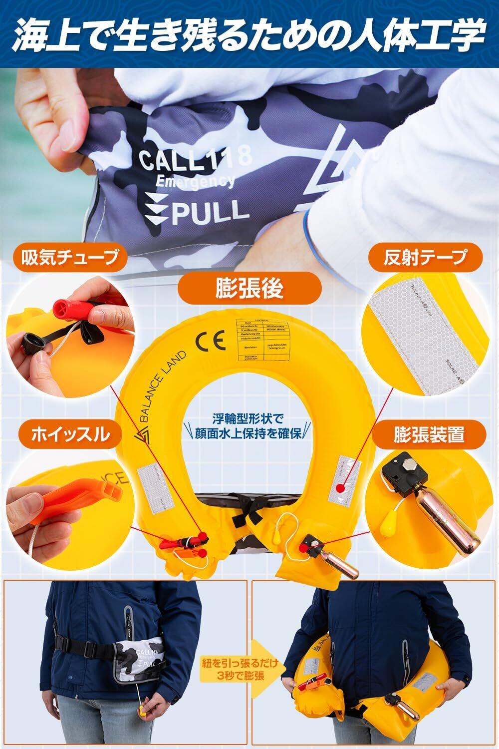 BALANCE LAND ライフジャケット 救命胴衣 手動膨張式 ベルトタイプ CE、ISO認証取得済 フリーサイズ 反射テープ付き ホイッスル付き 釣り 災害用 水泳 緊急用