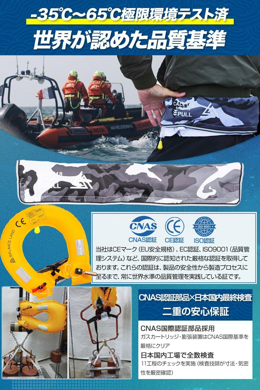 品質 お客様に安心できる買い物体験を与えるために、私たちの膨張式ライフジャケットは一年間の品質を提供いたします。ご購入日より一年間以内に何かご質問や不満があれば、御遠慮なく、お問い合わせください。私たちは24時間以内に返信し解決いたします。