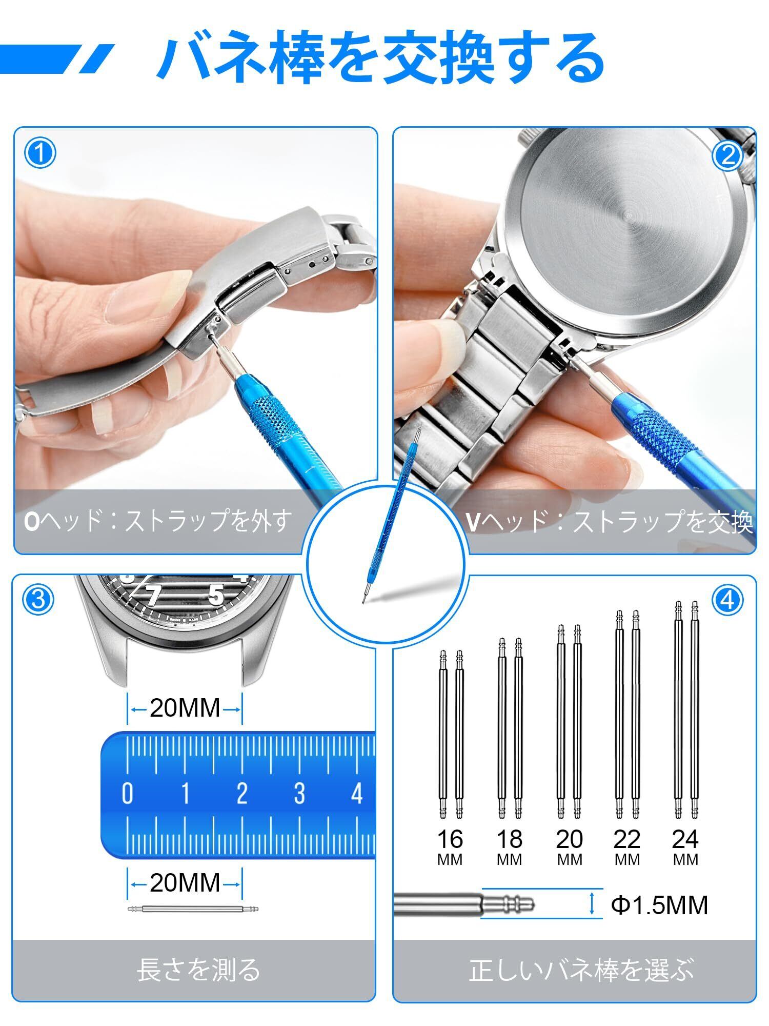 【ブレスレット取り外しツール】ウォッチ・ブレスレットの取り外しや交換に加え、ウォッチ・ピン・ツールは使いやすく、別途定規を探すことなくピンの長さを測ることができます。