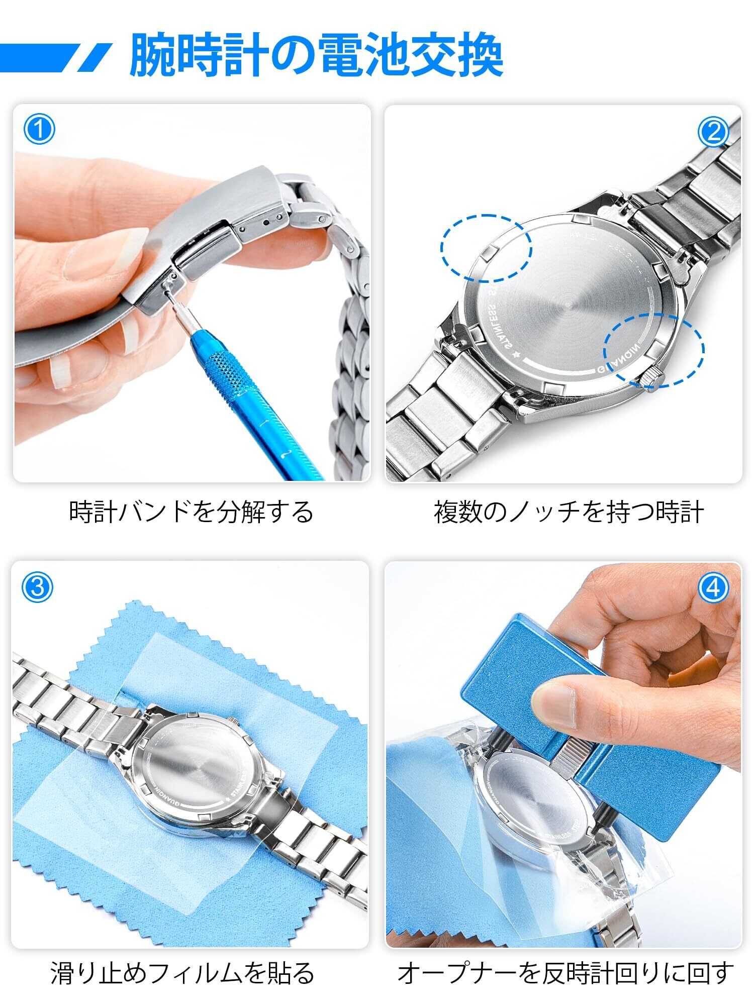 【以下の2種類のウォッチバックを開けることができます。】1. ケースバックに複数のノッチがある時計用の回転式ウォッチ・オープナー。開口範囲は15~60mmで、ダイヤルを回転させることにより、ビットとケースバックの溝との間の距離を調整することができます。2.こじ開け式ウォッチ・オープナー(注:このタイプの時計は、ケースバックを閉じるために追加の時計圧力ツールを購入する必要があります)。