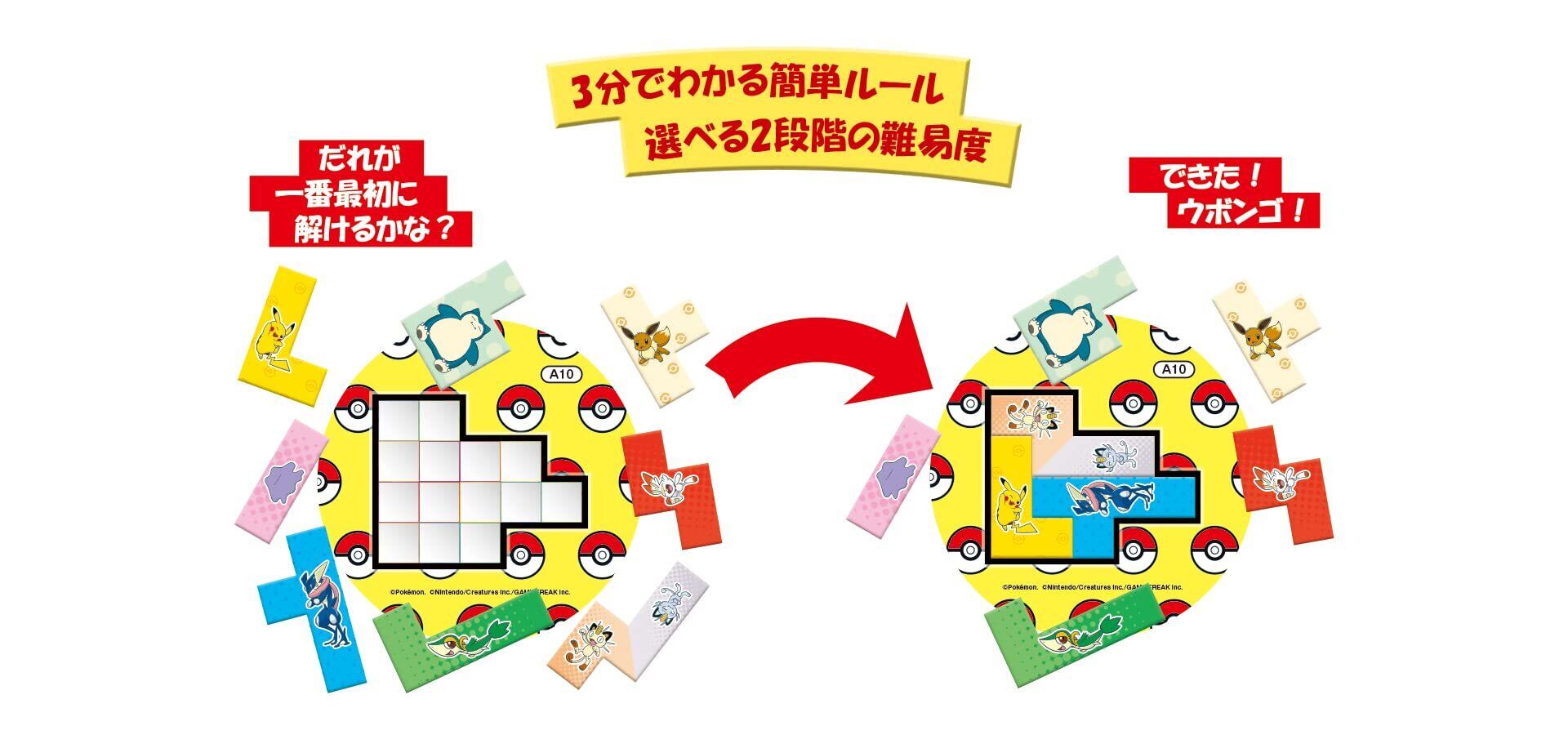 「ウボンゴ」の面白さはそのままに、ピカチュウをはじめとしたポケモンたちを収録したパズルピースと、モンスターボールをイメージした特典にもなるパズルカード。