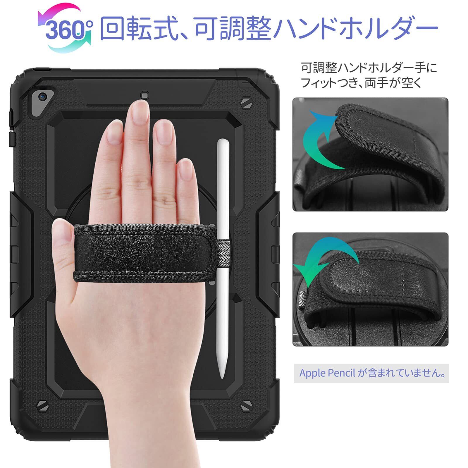 【360°回転スタンド&ペンホルダー】バックカバーの中心に360度回転できる回転盤があり、そこには折り畳み可能なスタンドが組み込まれています。スタンドは回転盤に連動して360°旋転し、異なる立つ角度を実現できます。文字を入力する場合やビデオ通話を行う際には縦置きに、動画を視聴する時は横置きに、お好みの位置に自由に回転させることができます。また、調整可能なハンドストラップが付き、片手でiPadを操作でき、落下や滑りなどのことを防ぐことができます。さらに、ケースにはペンホルダーも搭載されています。