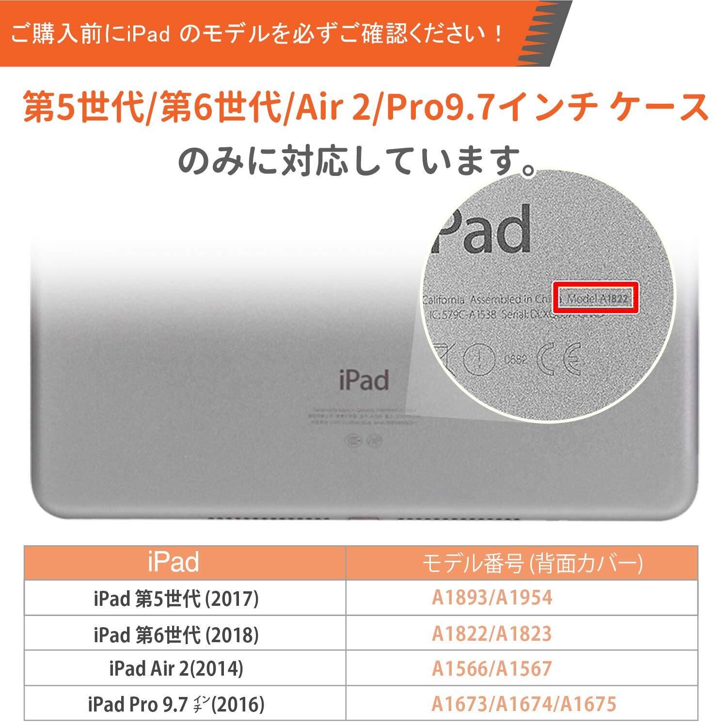 【対応機種】iPad 第6世代/ 第5世代/ Air2 /Pro 9.7 インチ専用のデザインです。対応モデル:A1893/ A1954/ A1823/ A1822(iPad 第6/5世代 2018/2017), A1566/ A1567(iPad air2 2014), A1673/ A1674/ A1675(iPad Pro 9.7インチ 2016)。※ご注文の際に、お手元機種の背面にあるモデル番号(AXXX)を対照し、確認をお願い致します。