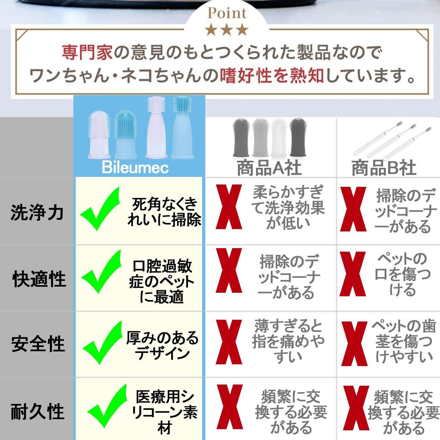 【兽医共同开发】Bileumecの多年にわたる製造技術と獣医のアドバイスを組み合わせ、使いやすい犬の歯ブラシを作りました。オーナーと犬の両方にとって安全で信頼性の高い商品です。