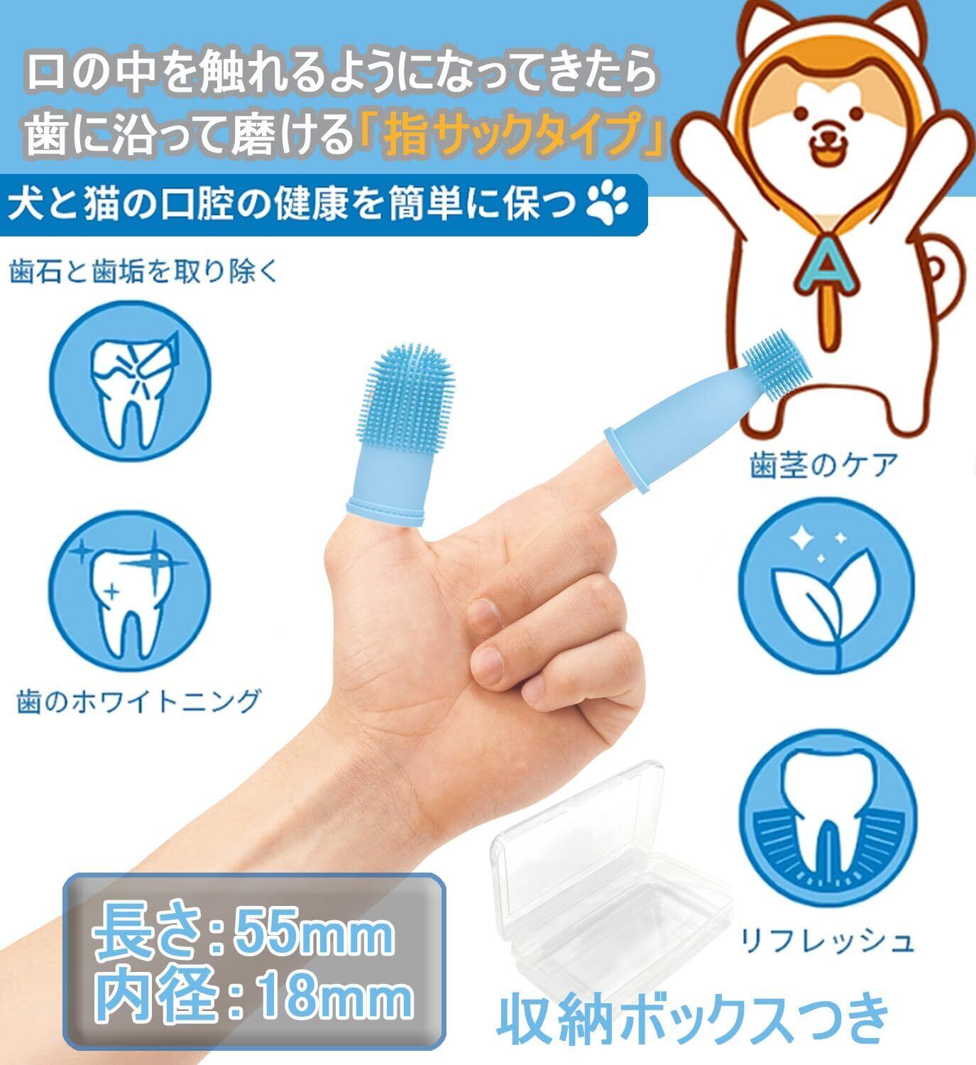 【操作】指につけて歯磨き粉をつけるだけで簡単に犬の歯の汚れを落とすことができます。使用後はきれいな水で洗い流し、保存箱に入れてください。