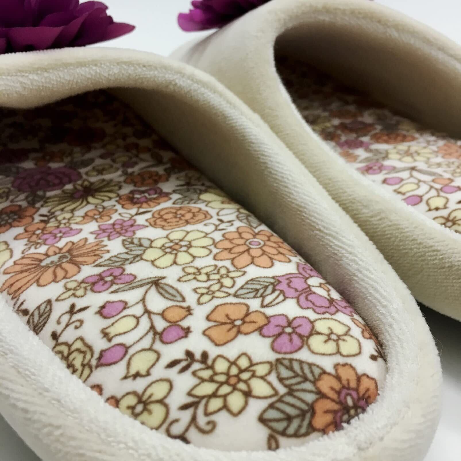 サテン生地の花モチーフを付けたインテリアスリッパ。中板には小花柄がプリントされた生地を使用、表生地にはふんわりと柔らかな綿ベロアのカラー生地を使っており、個性あふれるデザインになっています。ウォッシャブル(タンブラー乾燥不可)。