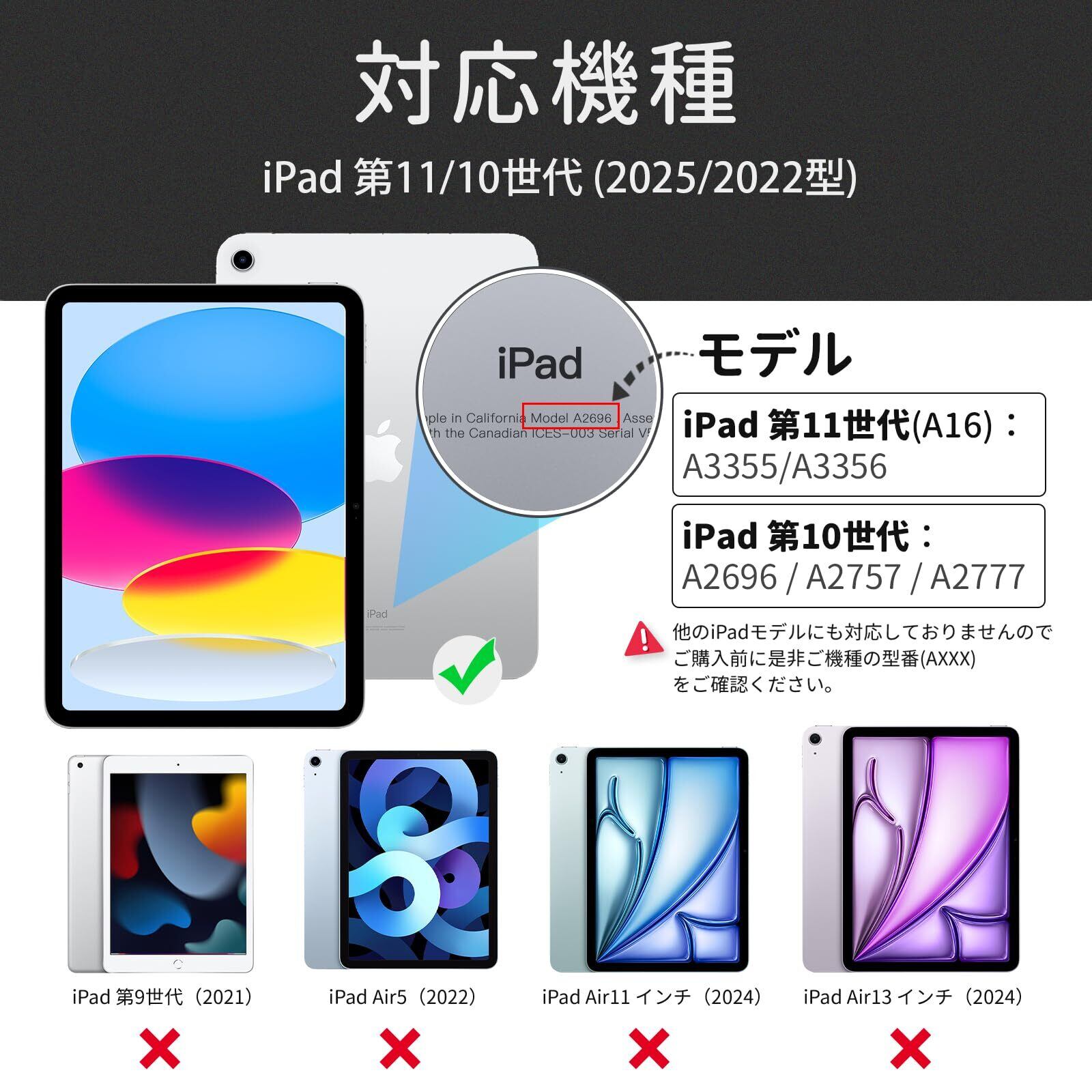 「対応機種」:iPad 第11/10世代 (2025/2022)専用デザインケース(対応モデル: A2696/ A2757/ A2777)。他の機種との交換性がありませんので、ご購入になる前に、ぜひご機種の型番を確認してください。