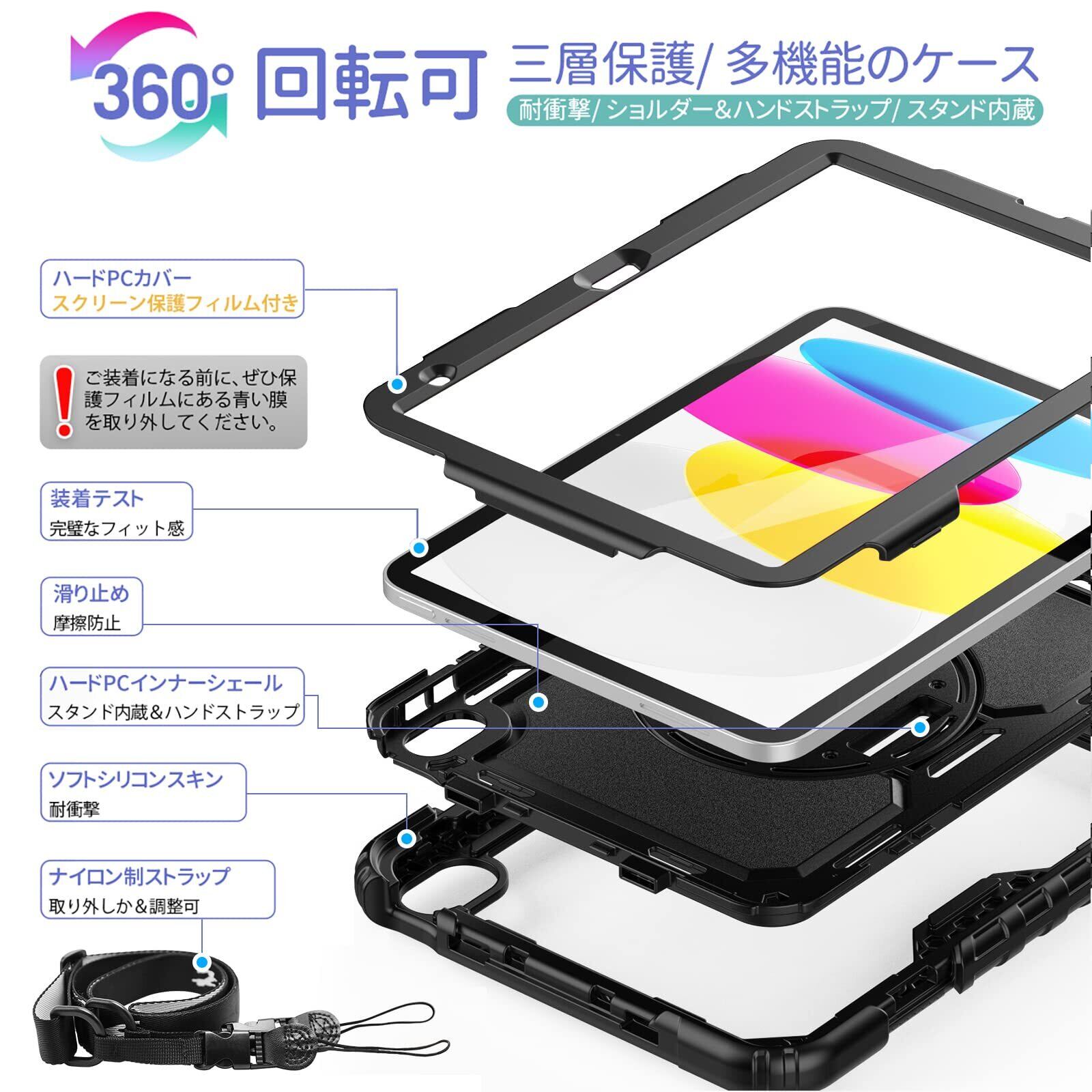 「三層保護デザイン」:画面フィルムありとなし二つの前カバー、回転盤内蔵の後ろカバー、素晴らしい耐衝撃性能を持つシリコンでiPad 11/10世代の本体を包んで一体にさせると、より強い多重保護を提供できます。意外での落としや衝撃や摩擦などをうまく防止できます。子供に渡すのも安心できます。