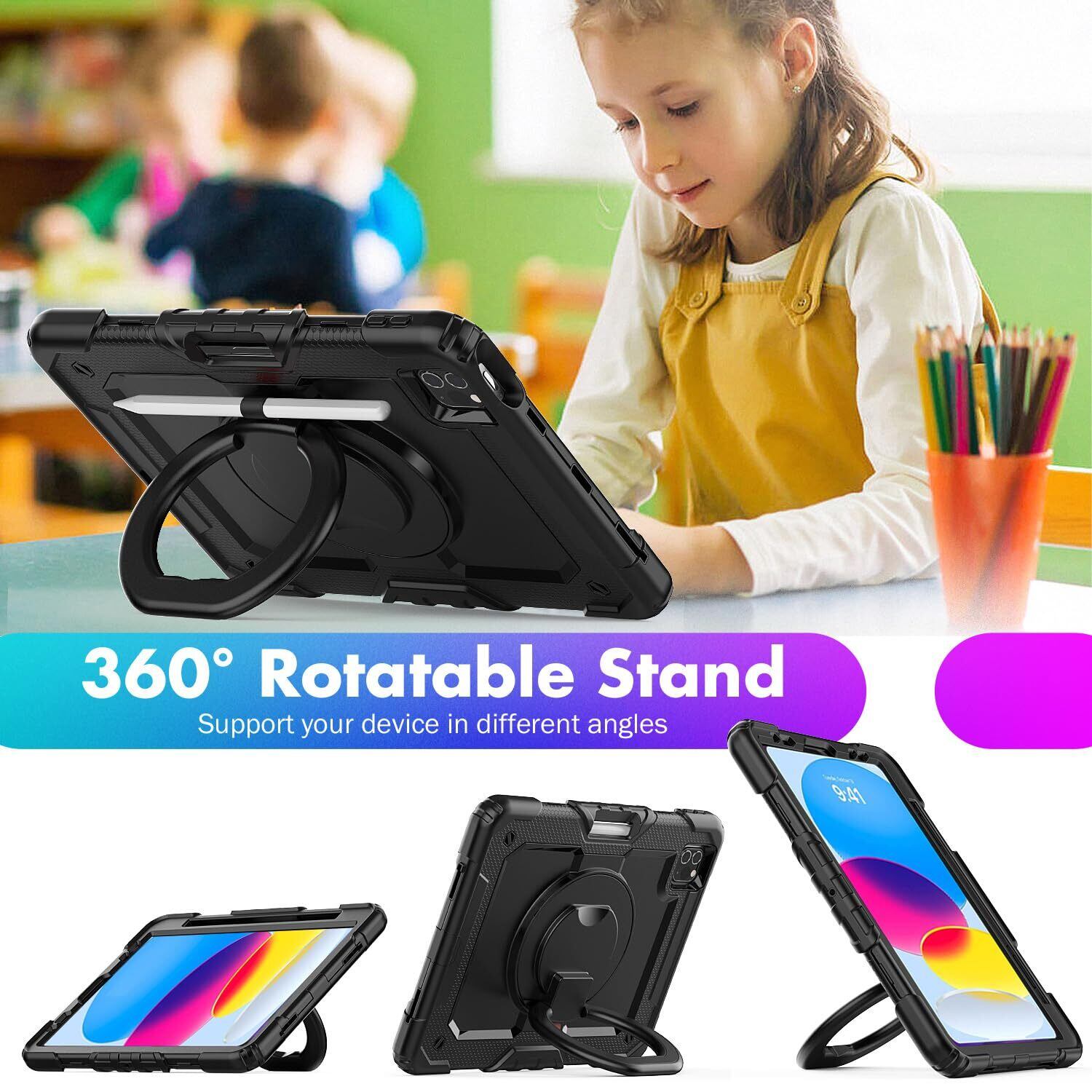 【人気商品】Timecity iPad (A16) 第11/10世代 ケース 2025新モデル 耐衝撃 iPad 10世代 (10.9インチ) / 11世代 (11インチ) カバー 360度回転リングスタンド 保護フィルム付き ペン収納 ショルダーストラップ付き 頑丈 傷防止 2025/2022 アイパット 第11/10世代 リングケース (ブラック) | gsmshop