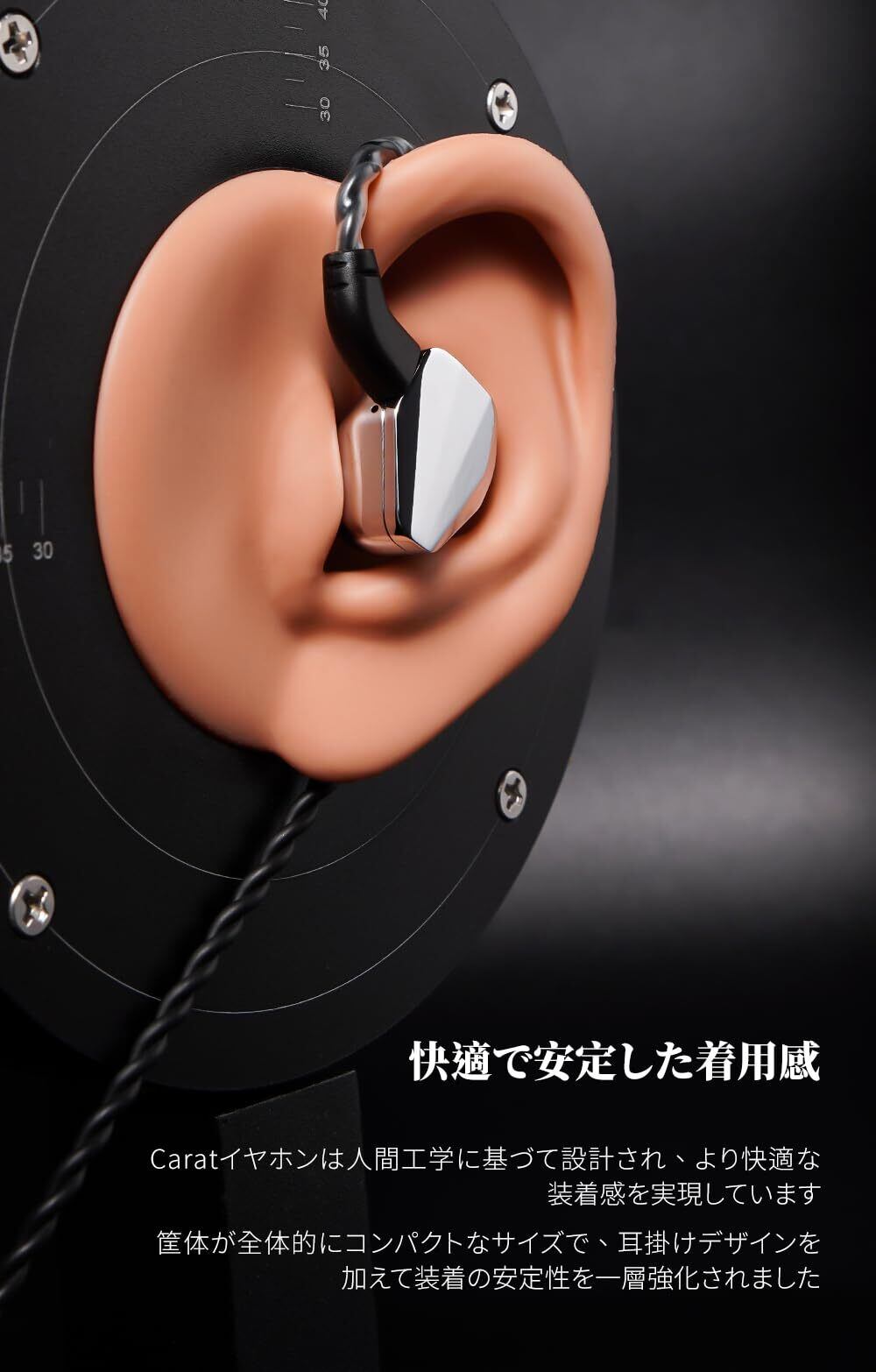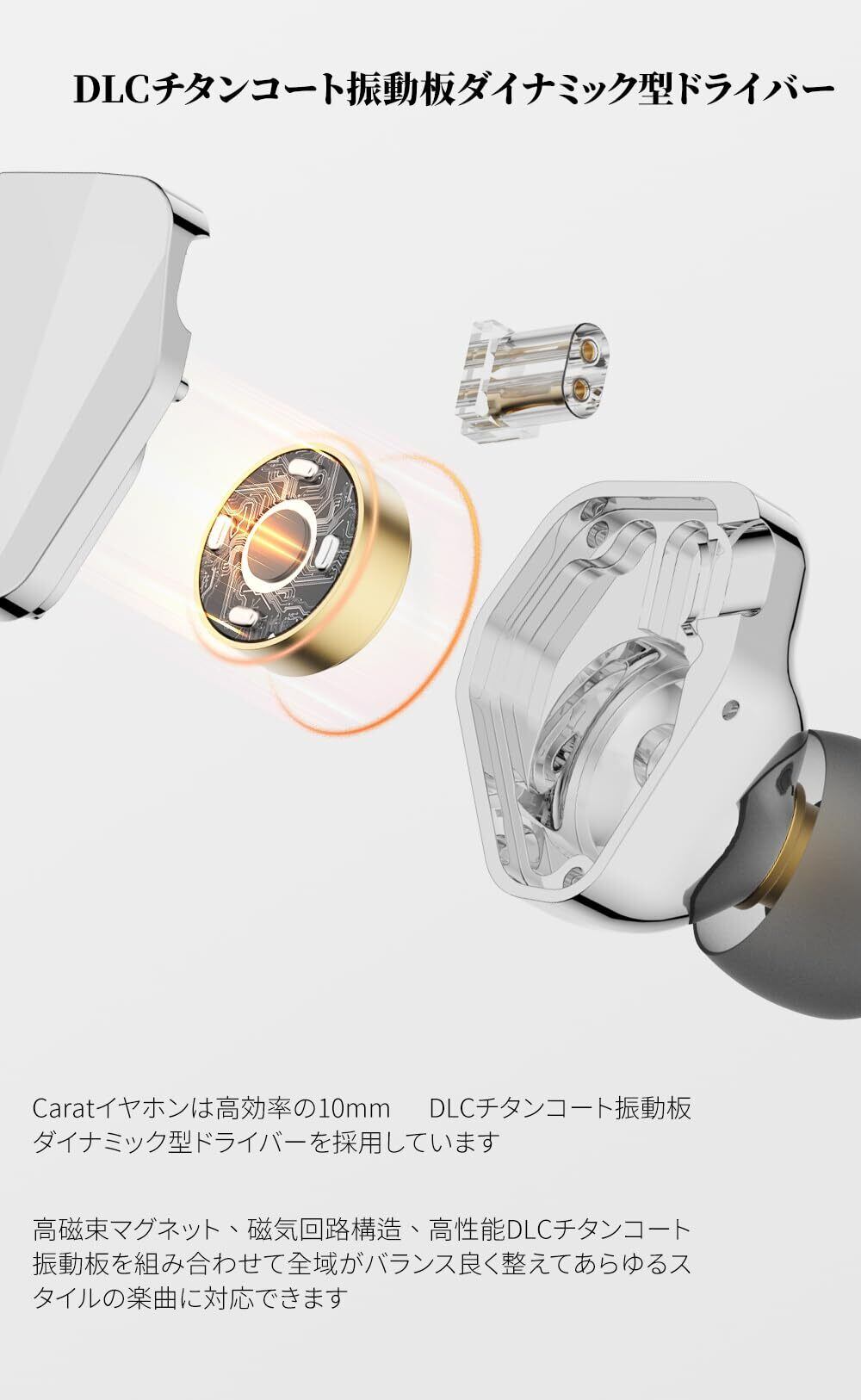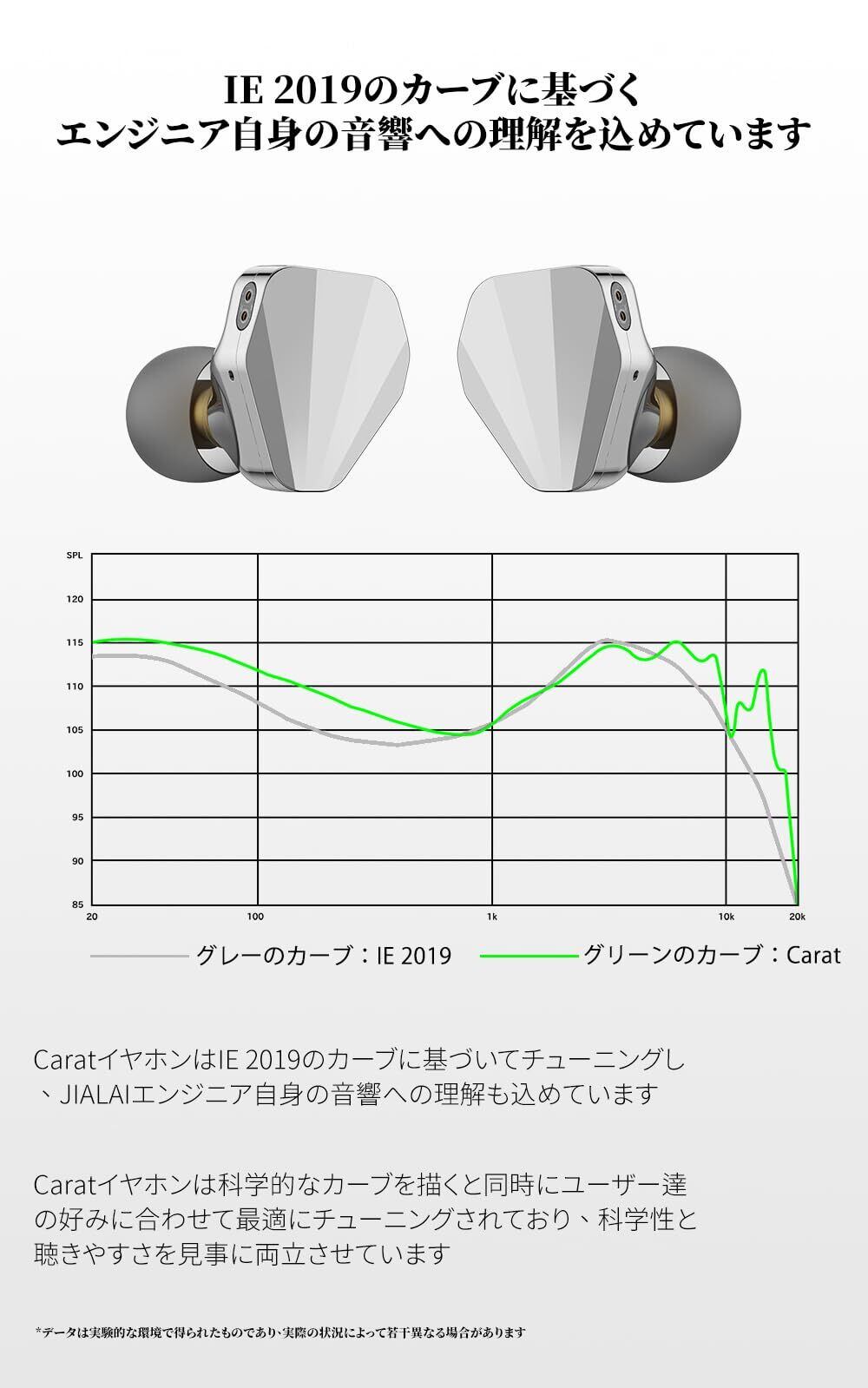 【旗艦級レベルのドライバー】Caratイヤホンは旗艦級レベルの10mm DLCチタンコート振動板ダイナミック型ドライバーを採用し、高磁束マグネット、磁気回路構造を組み合わせて、全域がバランス良く整えてあらゆるスタイルの楽曲対応できます;IE 2019のカーブに基づいてチューニングされ科学性と聴きやすさを見事に両立させています
