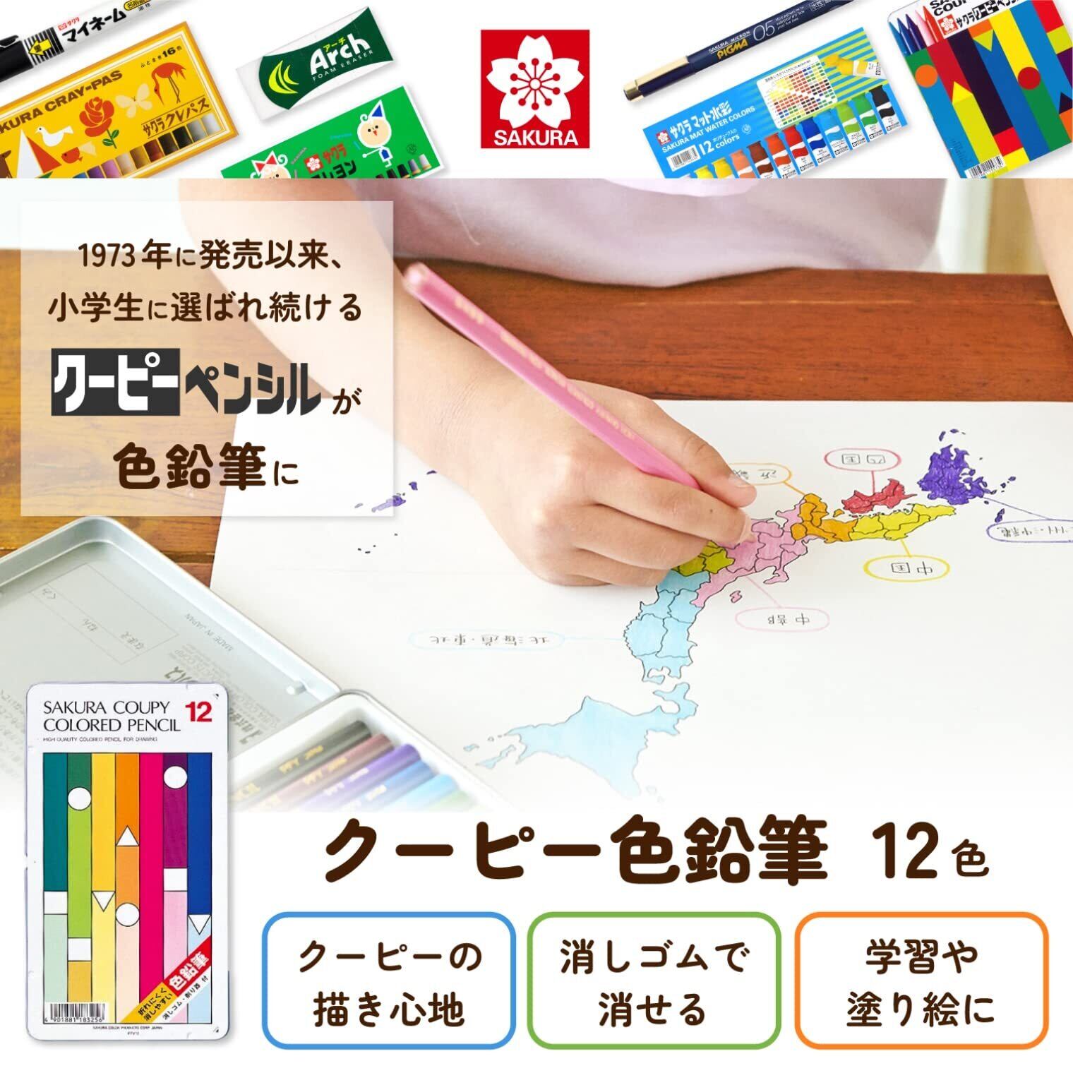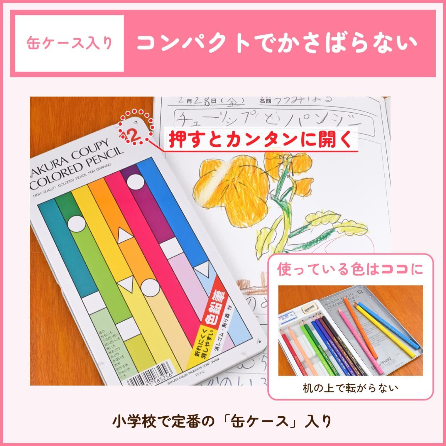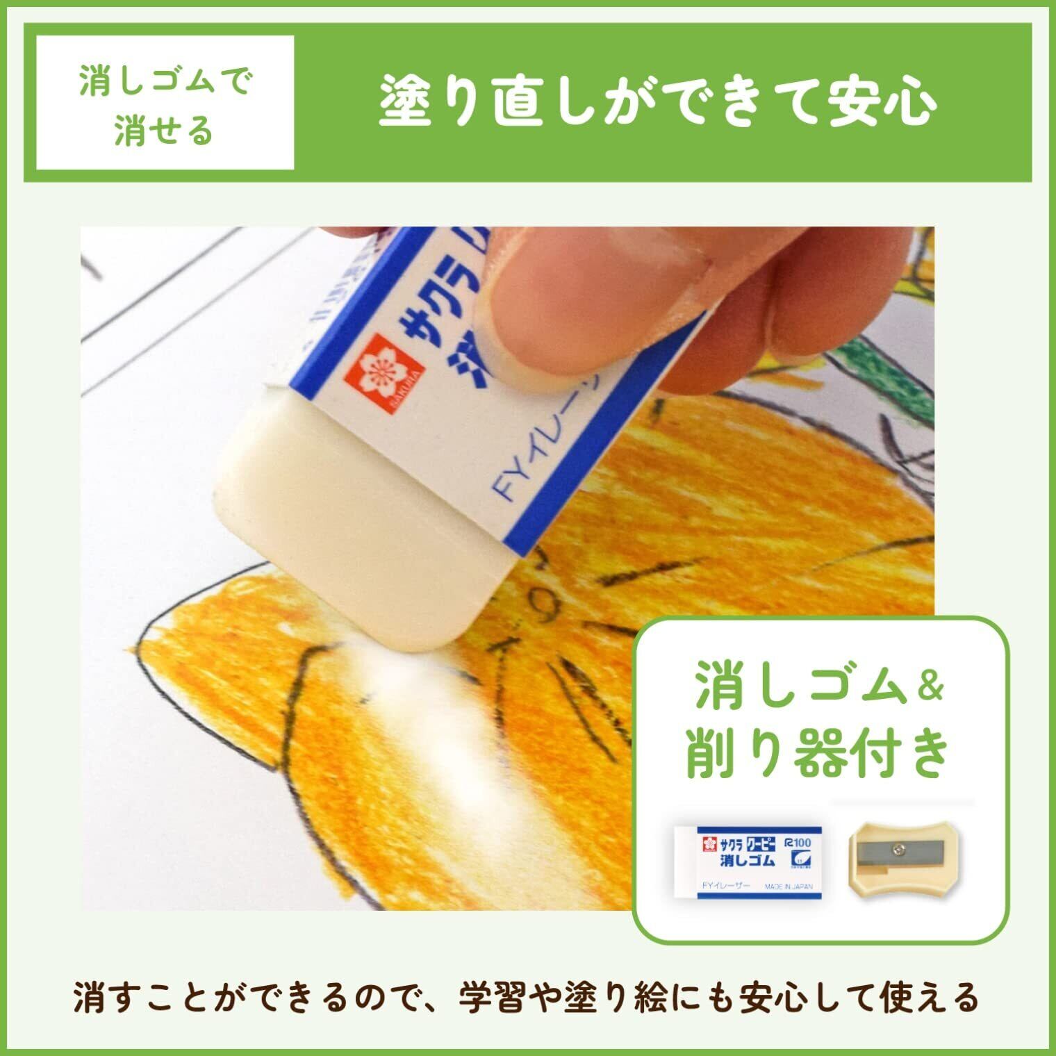 ●クーピー色鉛筆は従来品と異なり、消しゴムで消しやすい色鉛筆です。●ポリマー芯なので均一な品質です。●軸の中で芯が折れているといったことがほとんどありません。●消しゴムと削り器が付いています。