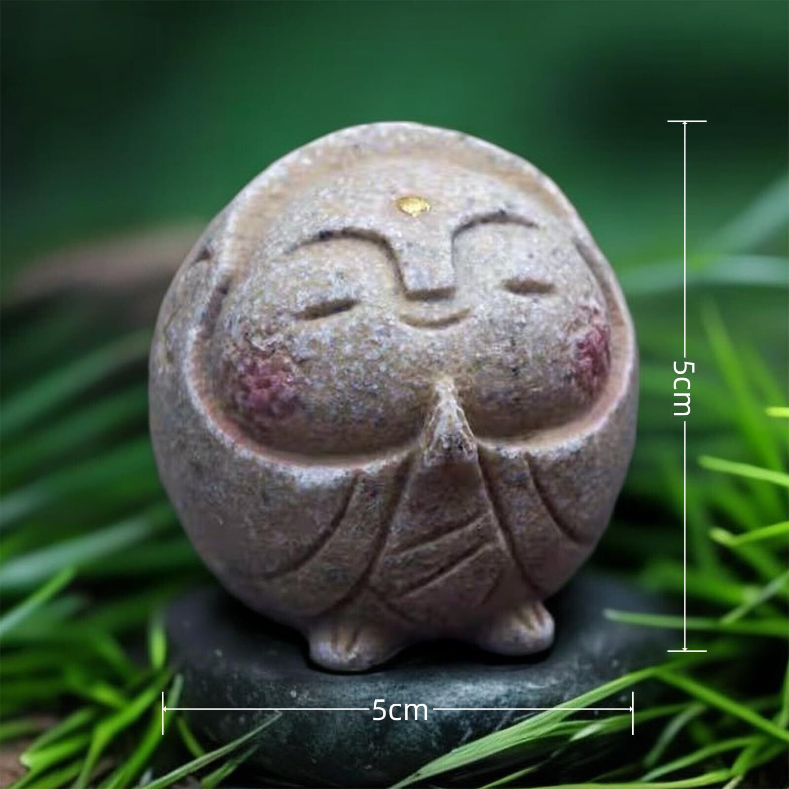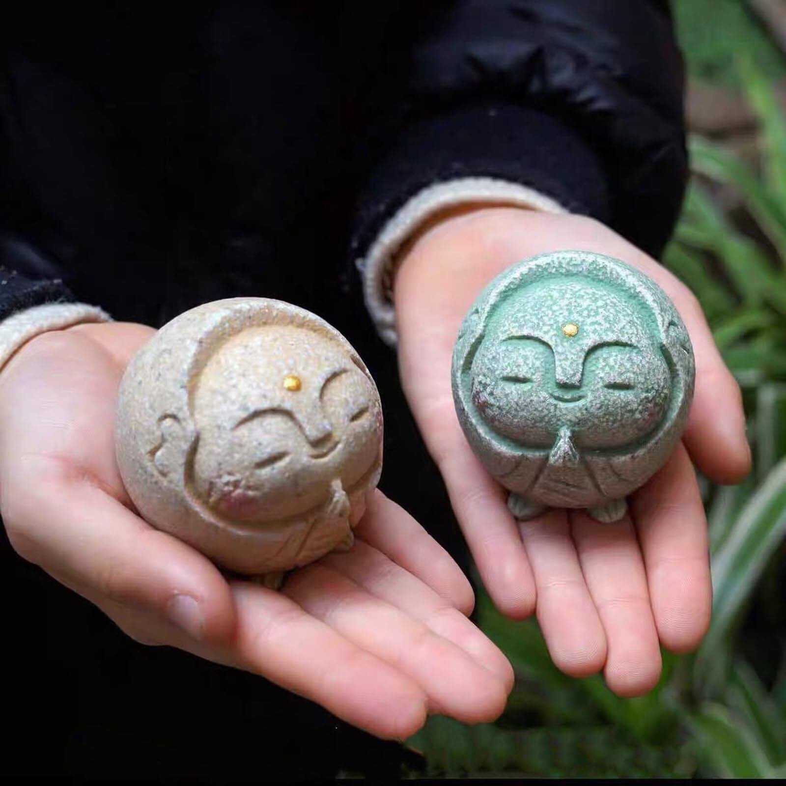 【店主からのメッセージ】:店主は京都の寺院を訪れた際、可愛らしい小さな僧侶や地蔵菩薩の石像を発見し、面白く美しい意味を感じました。帰宅後、名工の彫刻模型を探し、砂岩合成技術を使用して美しい小さな飾りを制作しました,白御影石で作られた手のひらにのせられる小柄なお地蔵さんです。