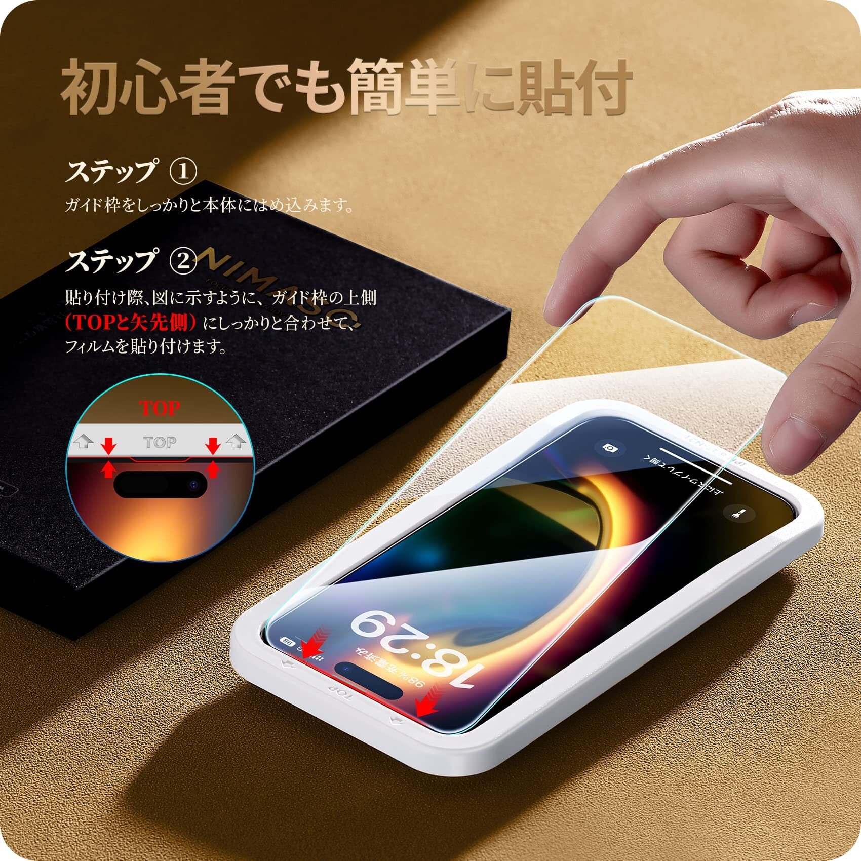 【貼付簡単】専用の貼り付けガイド枠が同梱されています。ガイド枠を利用することで、本体とフィルムがズレることなく、だれでも簡単にフィルムを貼ることが可能です。また、フィルム自体のシリコン自己吸着層により、位置を合わせて上から軽く置くだけで気泡が入ることなく簡単に装着できます。ガイド枠下部が特殊な設計となっており、万が一貼付けに失敗しても、ガイド枠を外すことなくフィルムの貼り直しが可能です。また、ガイド枠の素材はABS(合成樹脂)ですので、スマホに傷をつけない素材でございます。ご安心してお使いください。