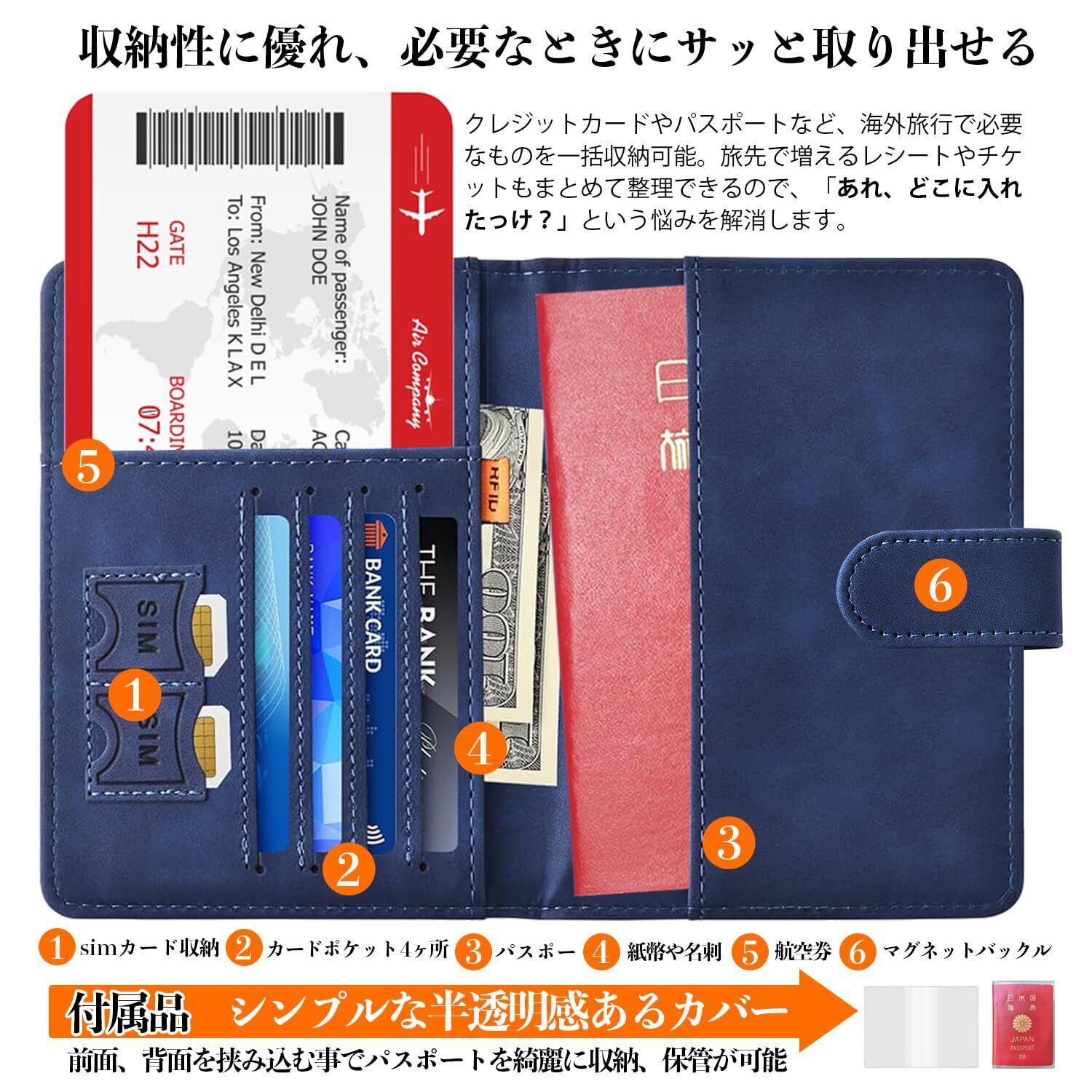 【多機能収納】外側はシンプルですが、内側はパスポート以外にも航空券、紙幣、クレジットカード、SIMカード等を収納できる多機能な作りです。旅先で増えるレシートや半券などもまとめて整理してしまえば、 「あれ、どこに入れたかな?」 なんて問題も解決