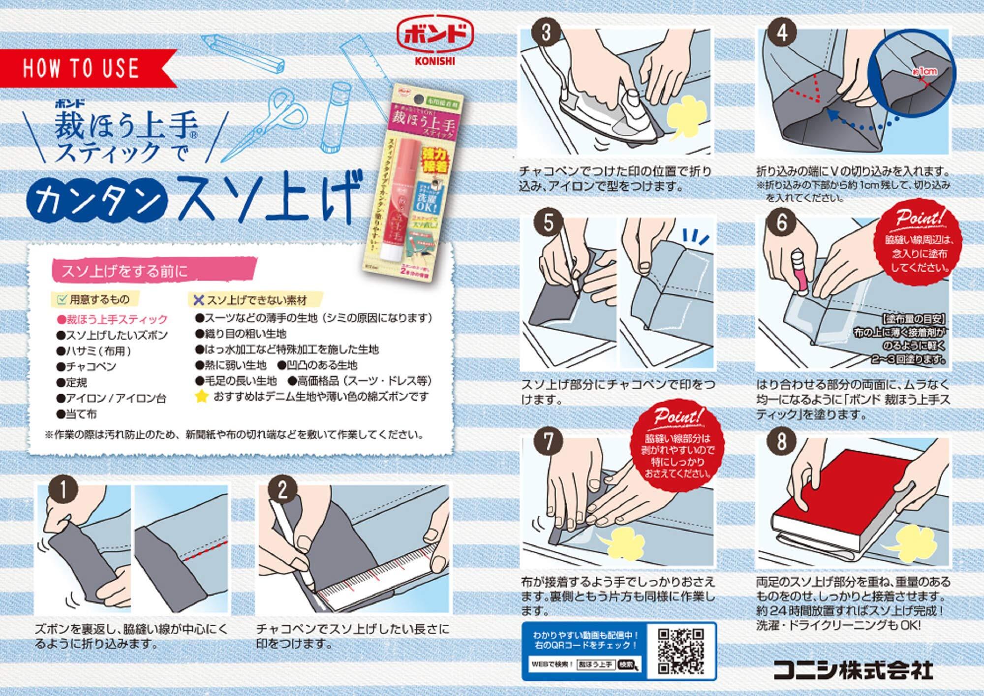 使用用途:ズボン・スカートなどの裾上げ。布同士の接着。ポーチなどの小物製作。