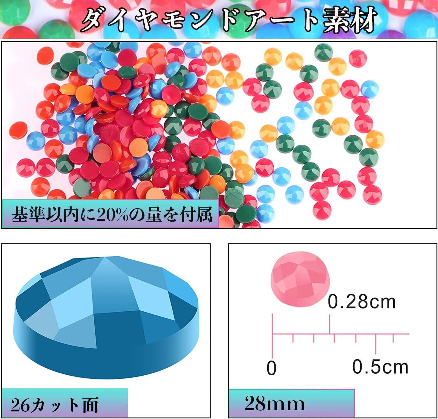 【ダイヤモンドアート素材】キラキラと輝く樹脂ダイヤは色鮮やかで色褪せません。基準以内に20%の量を付属しております。図案:保護フィルムに粘着性あり。健康に優しい素材で作られ、安全、制作は刺繍より簡単ですのでお子様や手芸初心者にもおすすめます。(6歳以上をお勧めます、子供は大人の世話の下で制作する必要があります。)