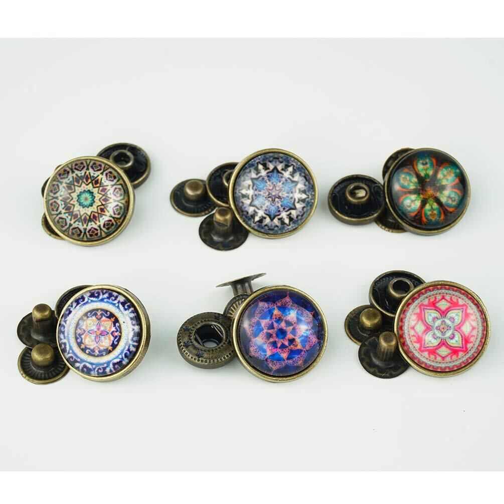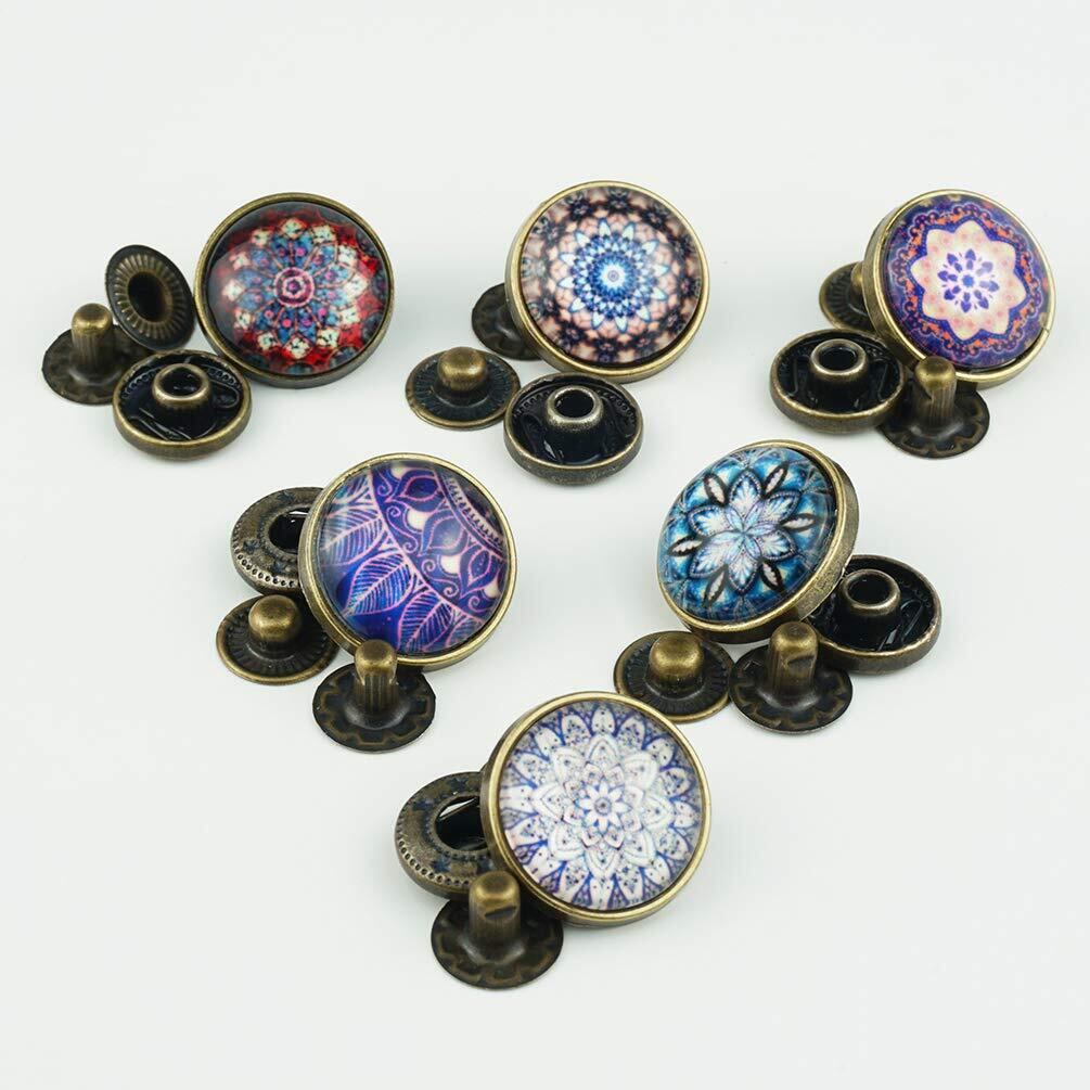綺麗でレトロなアジアンデザインのバネホックボタンのセットです。レザークラフトや布などの製品など各種手芸の製作用パーツとしてご使用ください。 ※ヘッド部分に傷が付かないよう、打台には当て布などをして慎重に打ち込んでください。