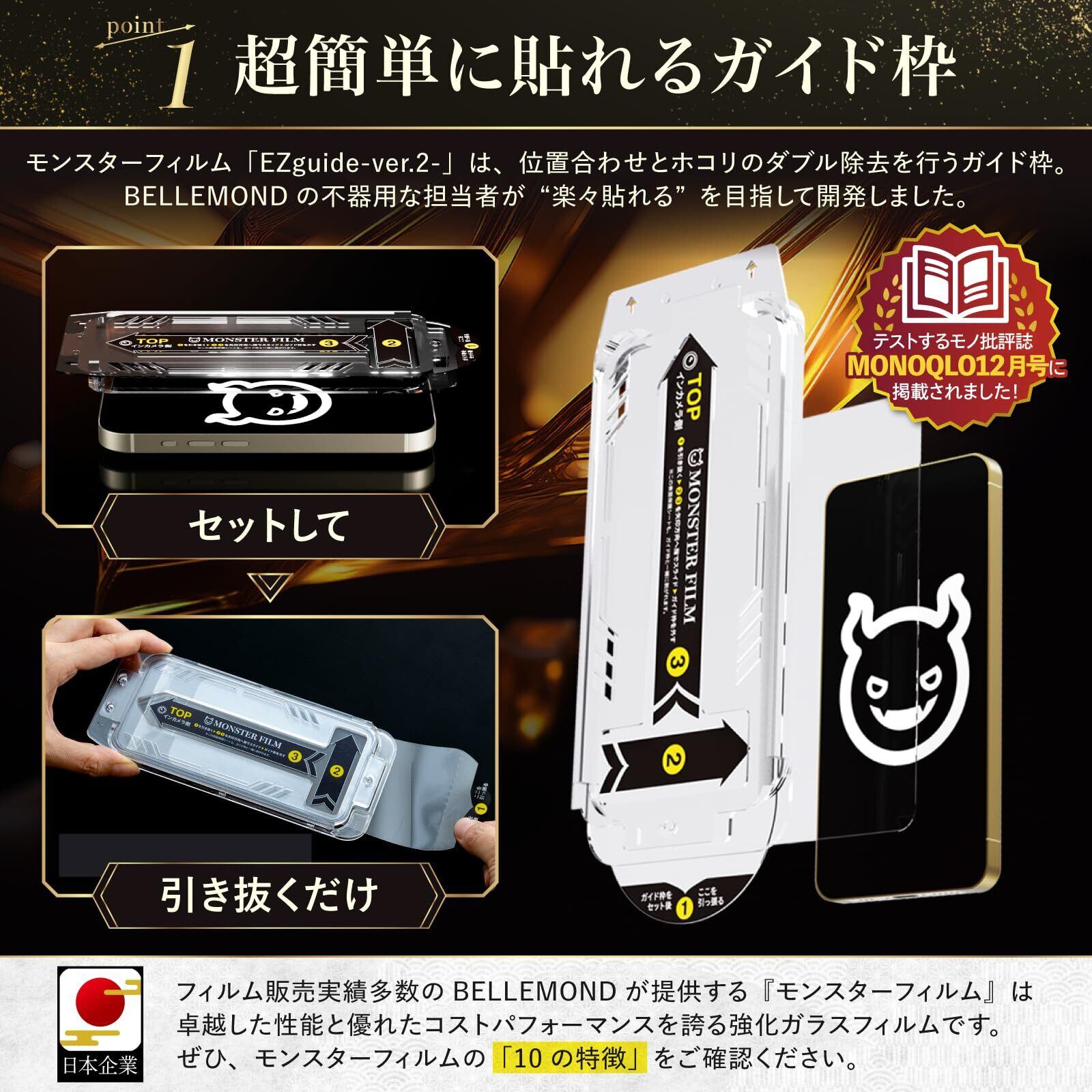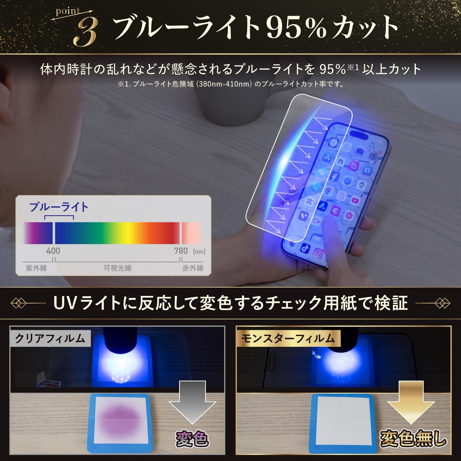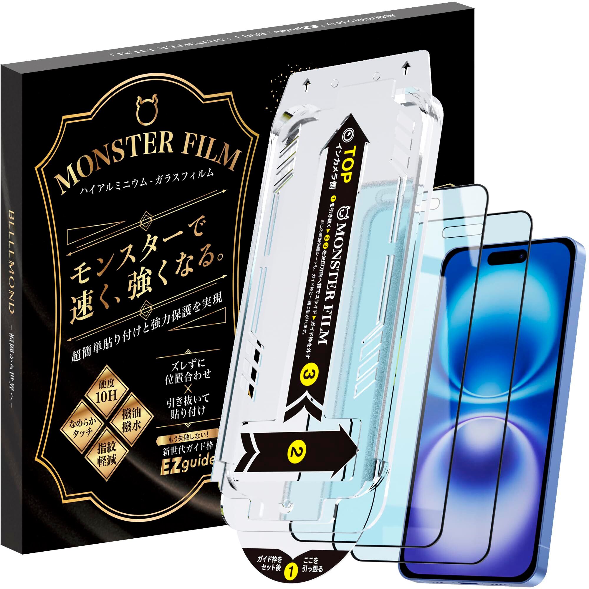 モンスターフィルム iPhone 16 / 15 用 ブルーライトカット ガラスフィルム | 2枚セット ガイド枠付き 黒縁あり 全面保護 | 貼りやすい アイフォン16 / 15 用 保護フィルム B1327