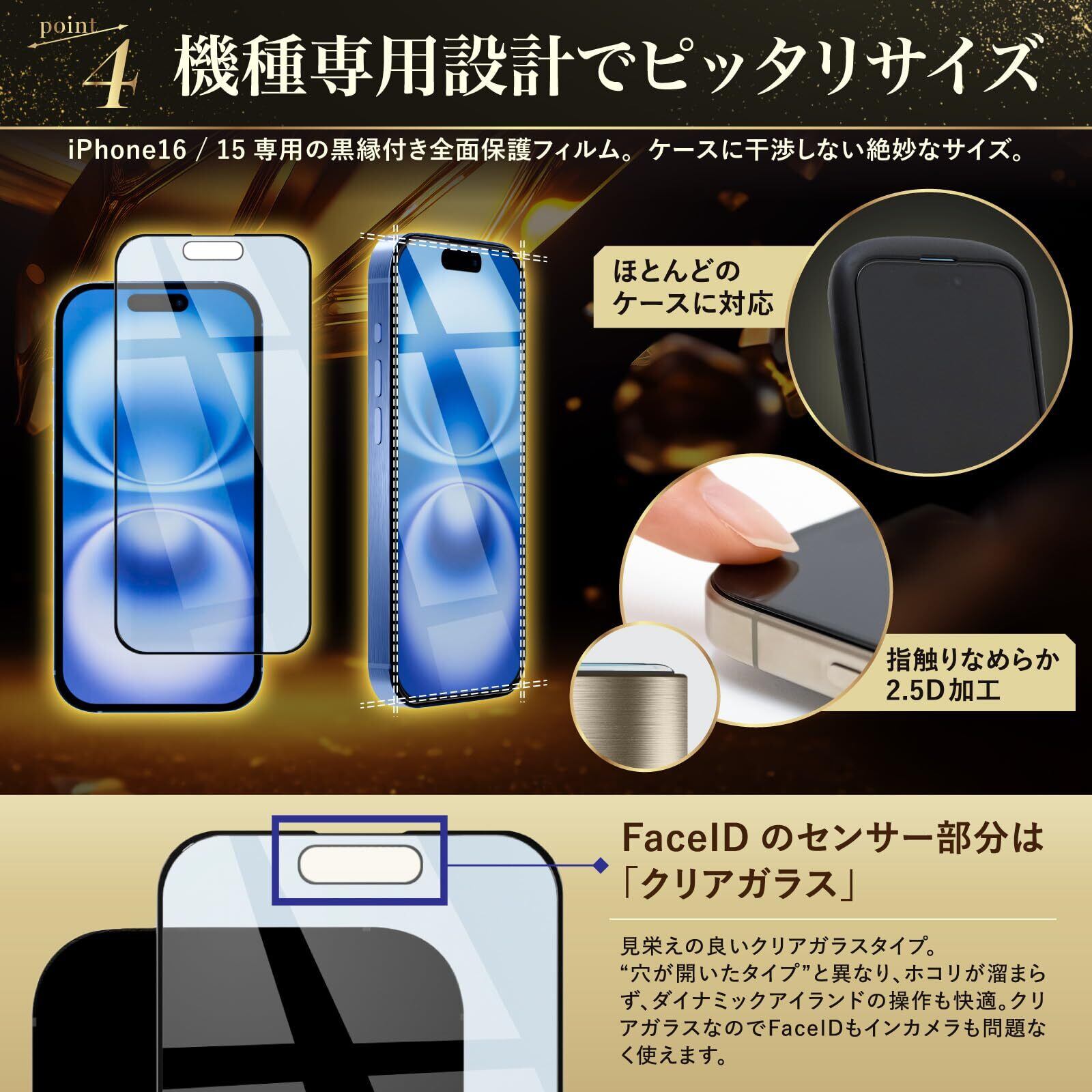 【対応機種】iPhone16/iPhone15の2機種に対応。【ブルーライトカットタイプ】カット率は95%以上です。黒縁付きの全面保護仕様です。※ブルーライト危険域(380nm-410nm)のブルーライトカット率【セット内容】アイフォン16、アイフォン15用のガイド枠付き強化ガラスフィルム×2、拭き上げキット×2、気泡除去用スクレーパー×1、説明書×1