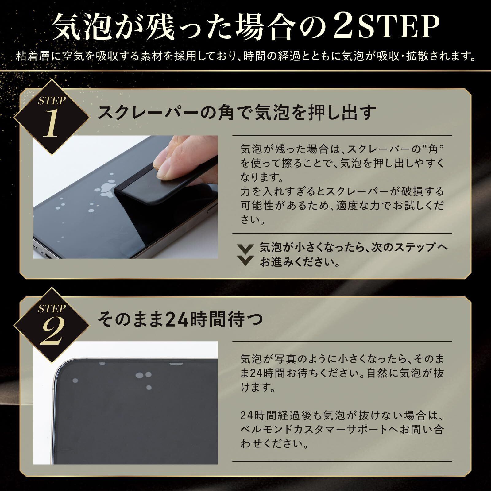 【気泡について】気泡が残った場合は、スクレーパーの角を使って気泡を細かくした後、24時間前後お待ちいただくと、自然と消えます。手順はページ下部に掲載中。24時間以上経過しても抜けない場合、ホコリが入っている可能性があります。【サポート】ベルモンドは福岡県に本社を置くブランドです。初期不良、割れ、傷、ズレ、ホコリ混入などありましたら、まずはベルモンドカスタマーサポートまでお問い合せください。