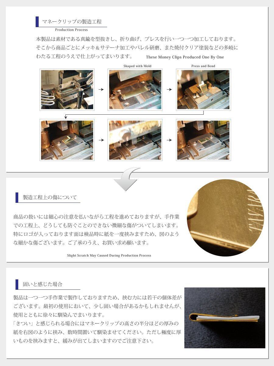 【※1】挟めるお札の枚数は日本紙幣二つ折りで最大約10~15枚枚ほどとなります。マネークリップの高さの3分の2ほどまでが目安となり、それを越えて挟みますと、極端に緩みがでる可能性がございますのでご注意下さい。【※2】製品は一つ一つ手作業にて製造しております。製造・検品作業上避けることのできない傷がございますこと、ご了承下さい。