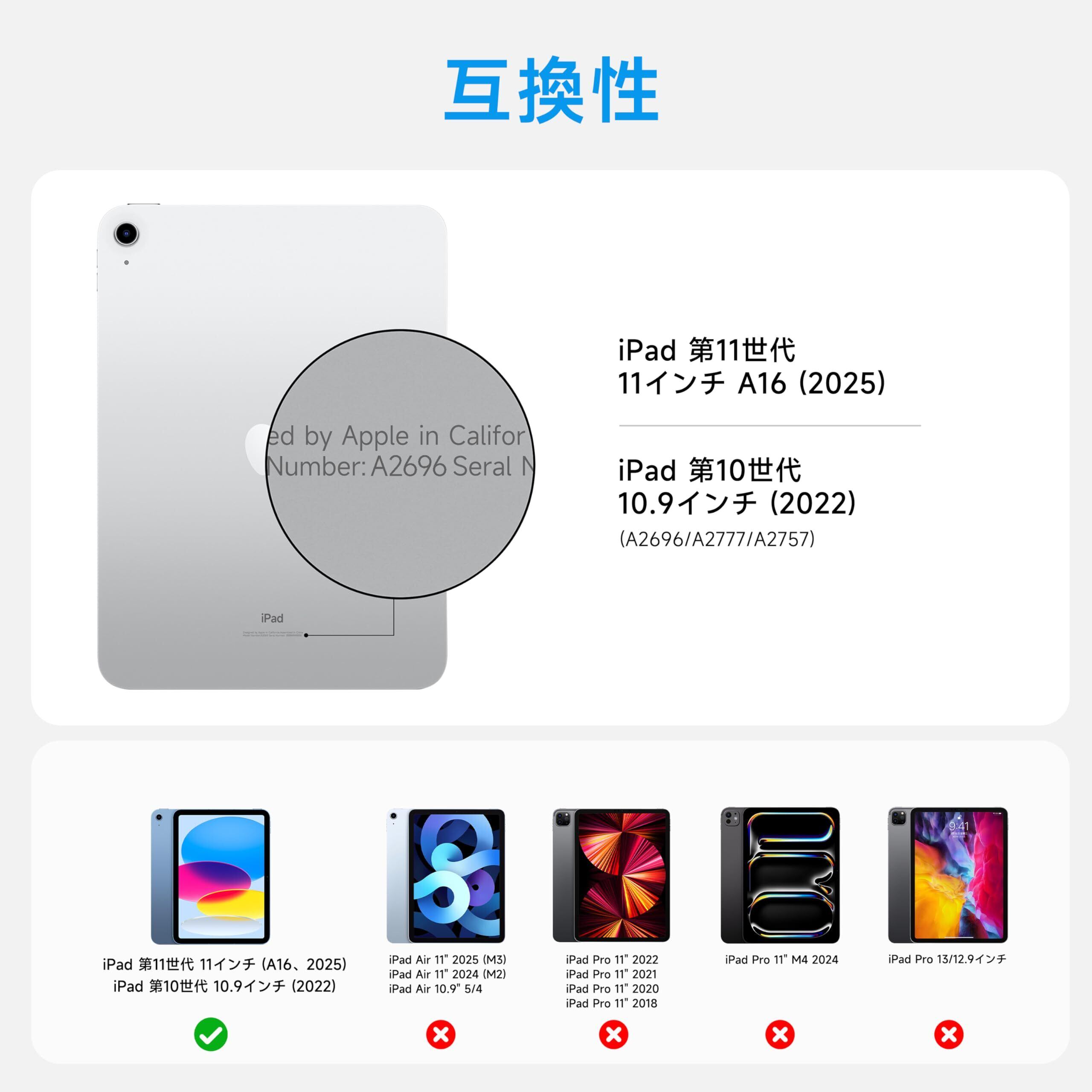 【対応機種】iPad 11 インチA16 2025/10世代キーボード 10.9インチ(2022年製)(A2696、A2757、A2777)とのみ互換性があります。互換性を確認するために、ご購入前にモデル番号をご確認ください。