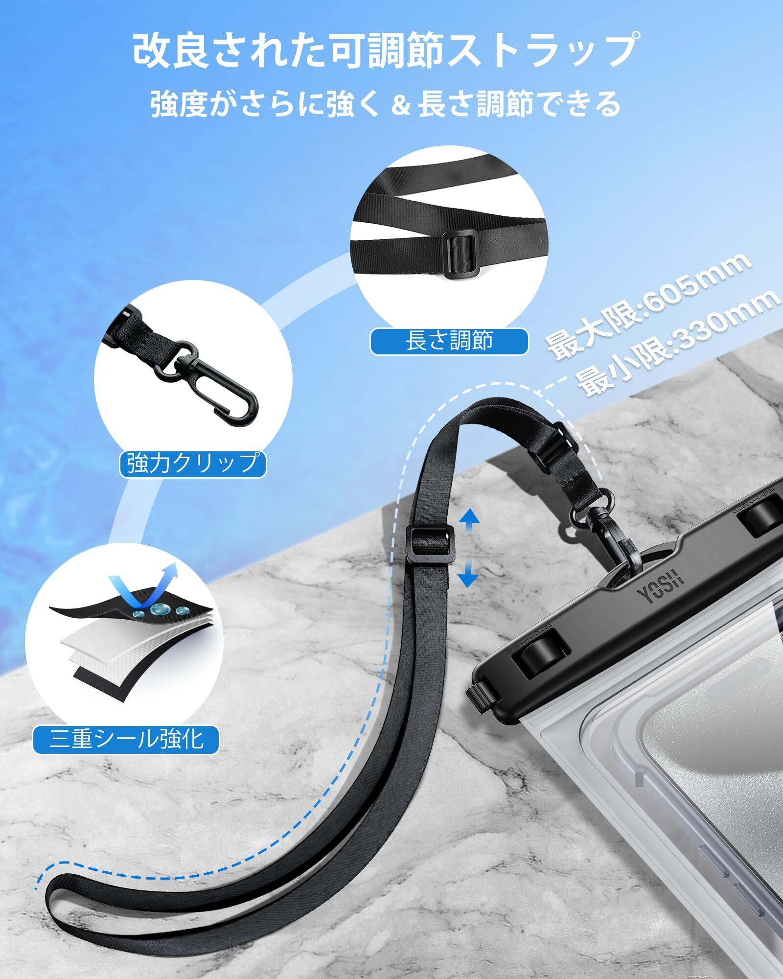 ストラップ改良&クリアな画面:YOSH防水ケースのストラップは肌に優しく、長時間掛けても快適です。ストラップの強度が上がり、落下防止と巻き取り防止が実現。圧倒的な透明度のフィルムで鮮明な写真・動画撮影、タッチ操作も可能です。スマホ以外に、パスポート、カード、現金なども収納できます。