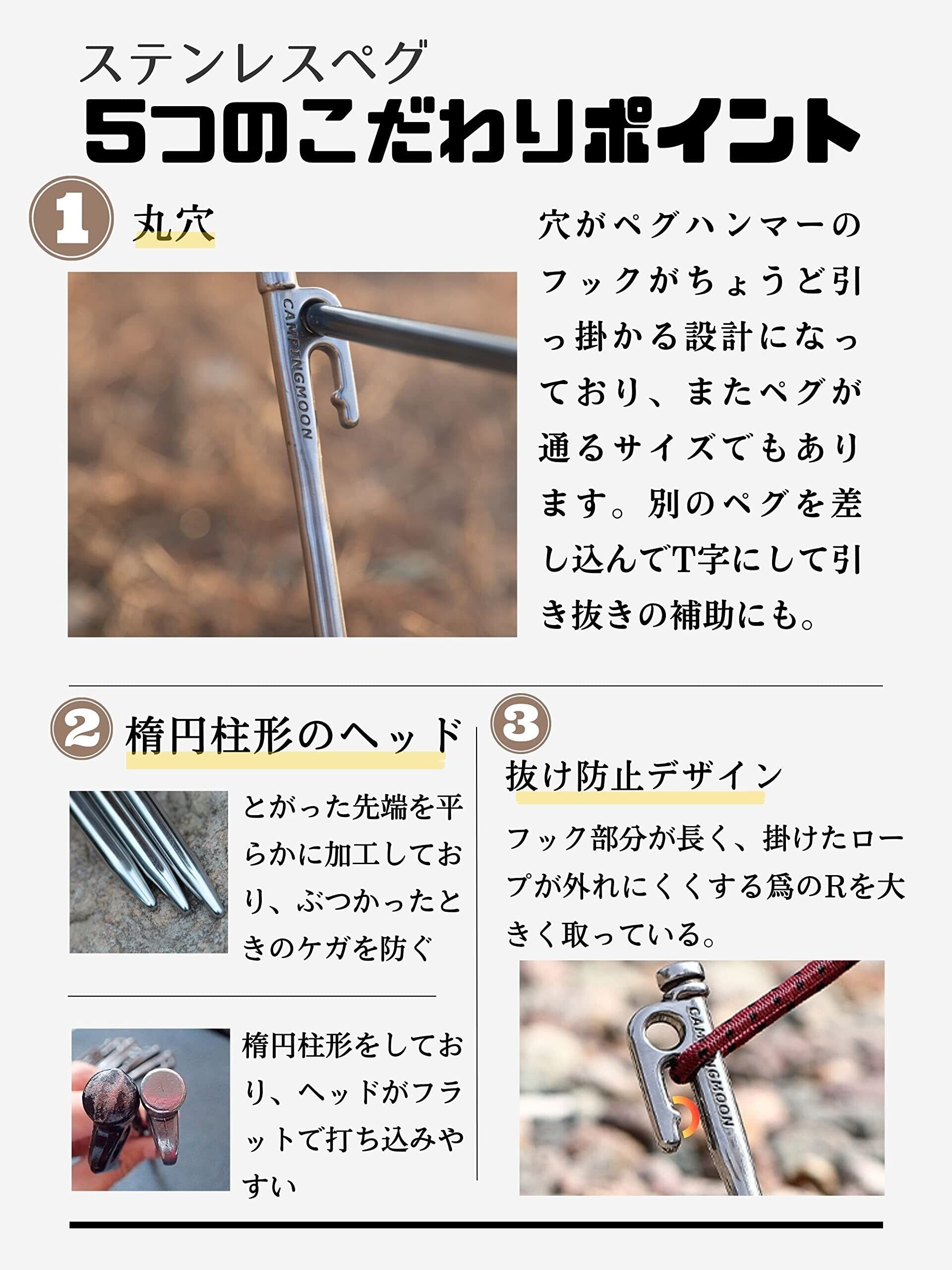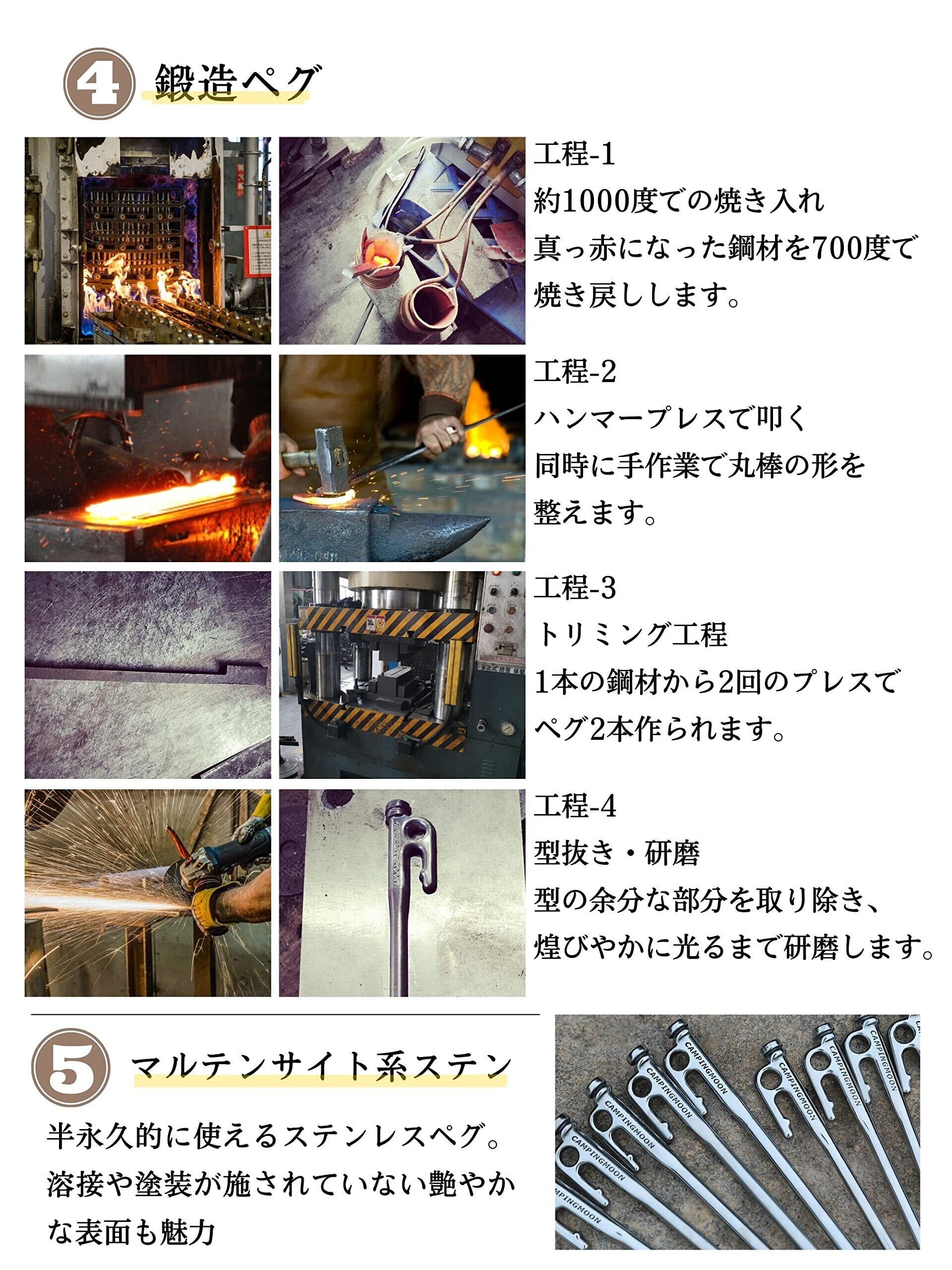 特徴:温度と時間を最適化をした熱処理から生まれた「頑丈さ」。タービンブレードに使われるほど強固なステンレス鋼を採用した渋い銀色の鍛造ペグ。