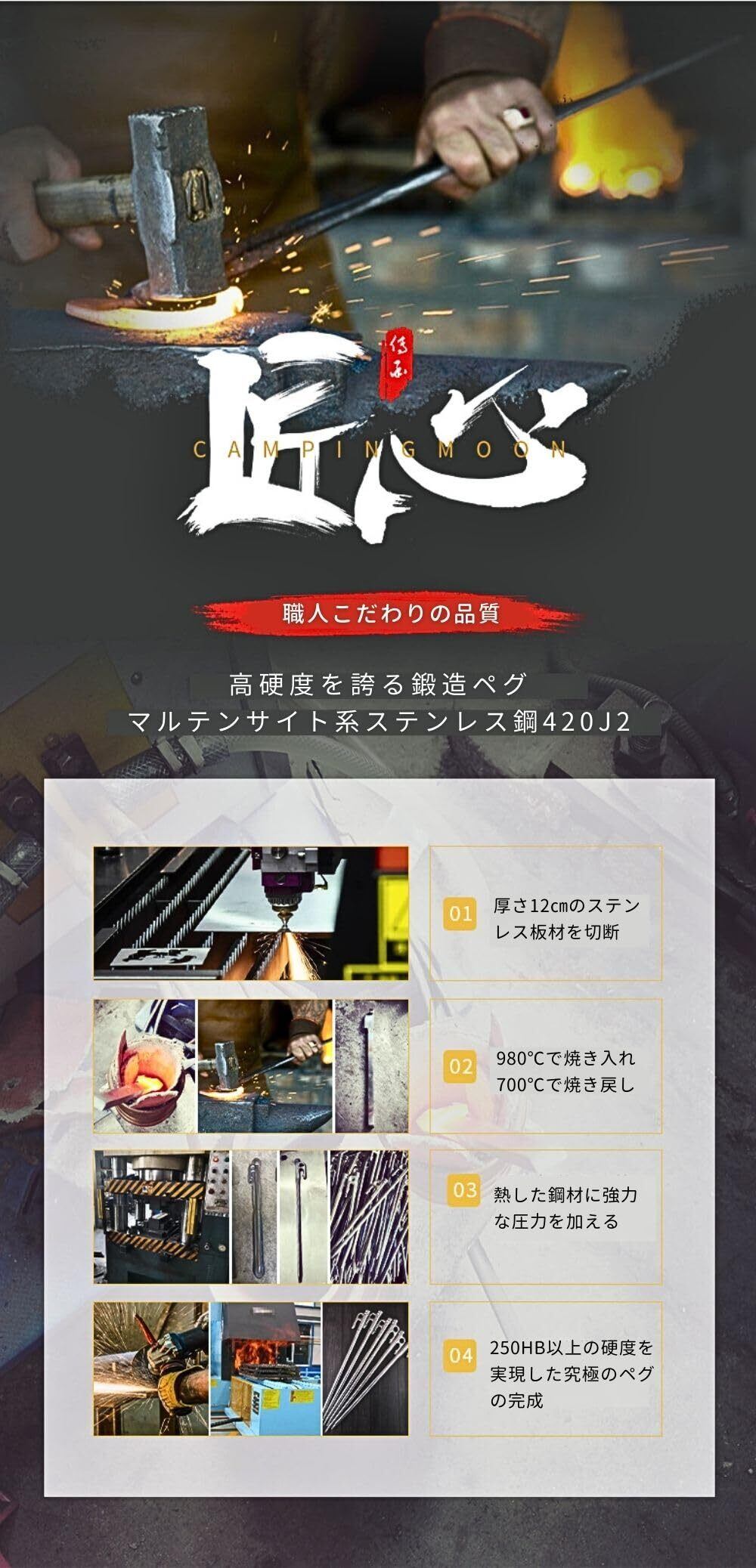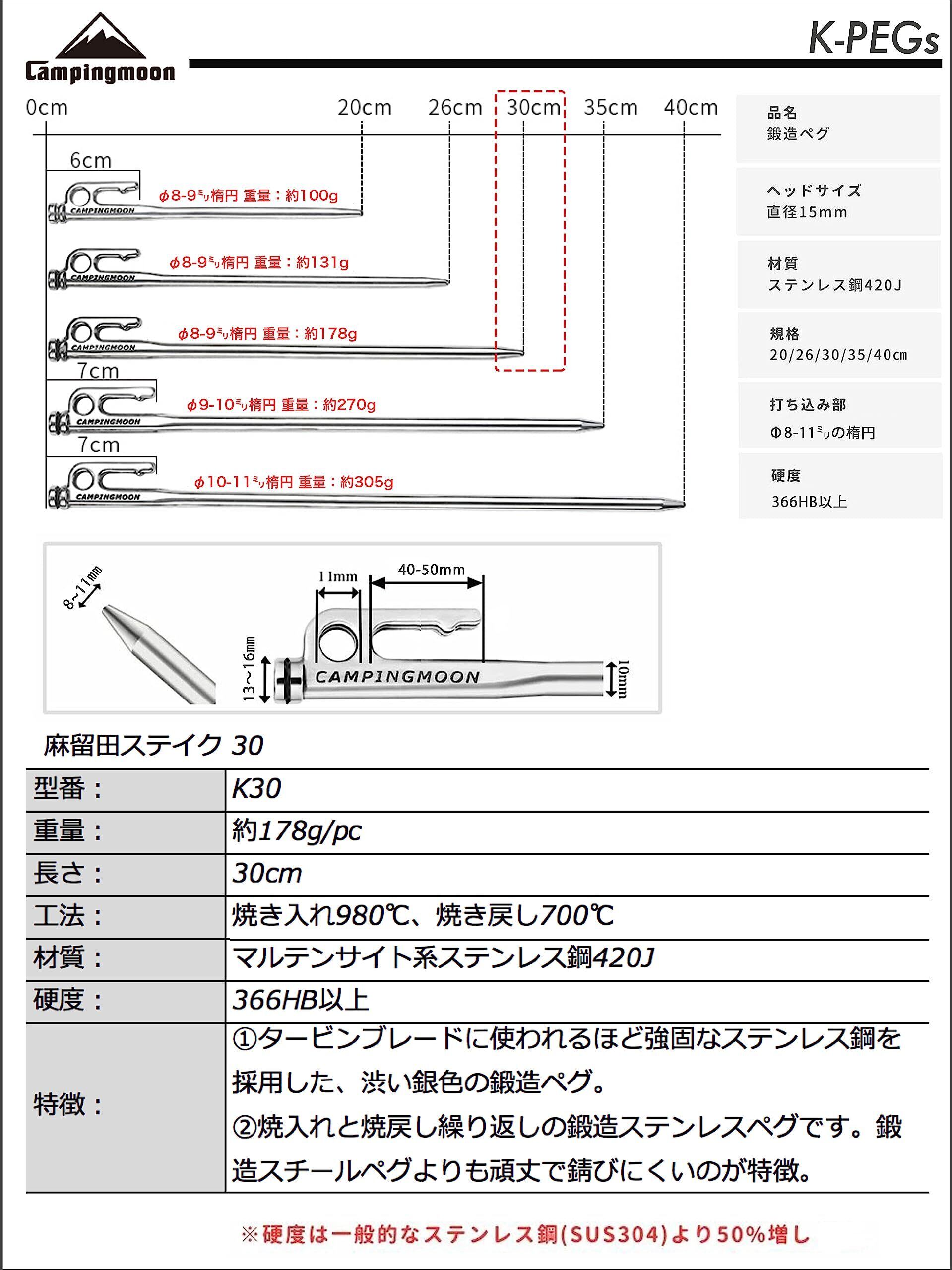 キャンピングムーン(CAMPING MOON) 鍛造ペグ ステンレスペグ 焼き入れ 疲労強度HB366-388 麻留田ステーク テント ペグ 30cm K30