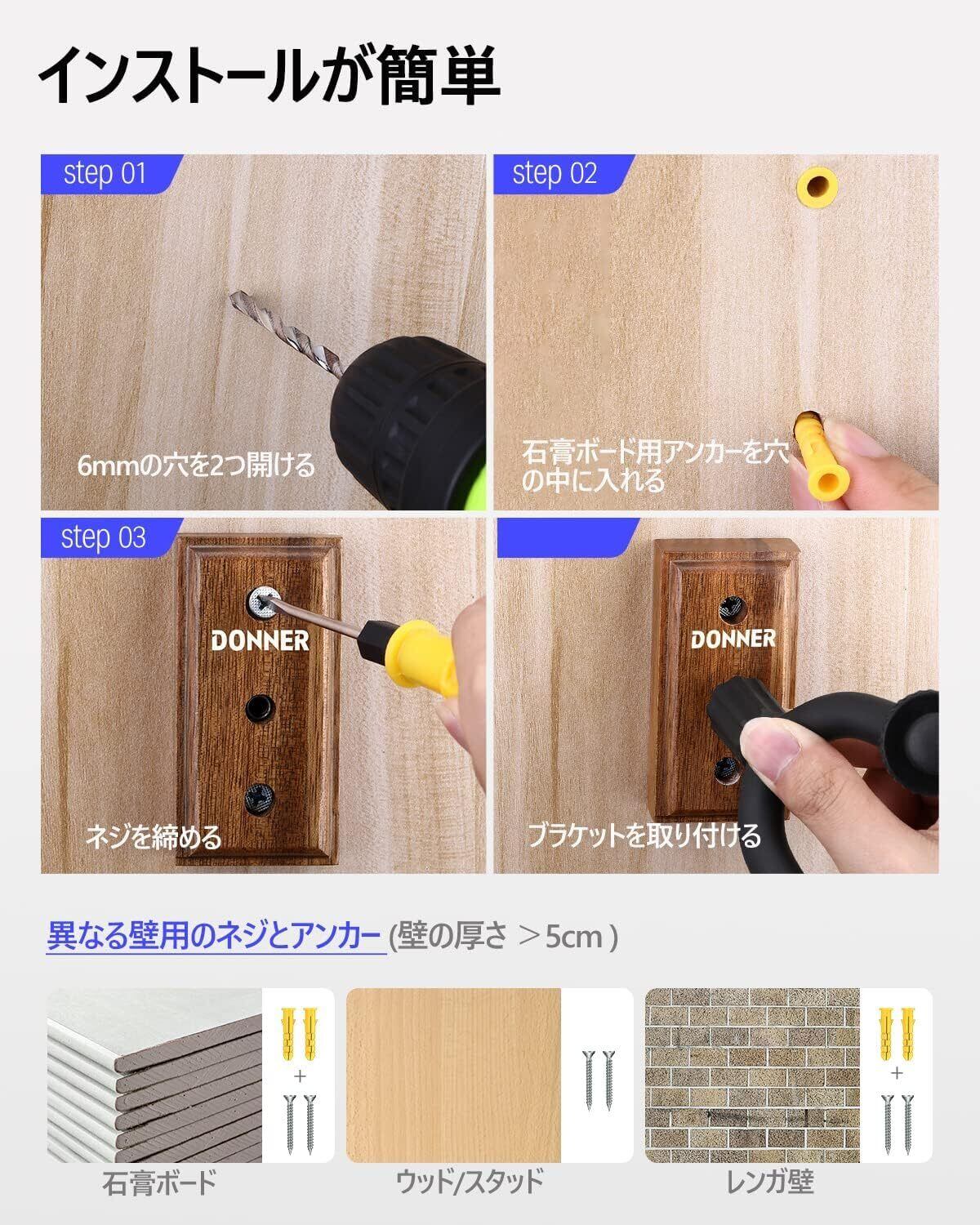 【ブラックウォールナット材】Donnerのギター壁掛けハンガーはブラックウォールナット材でできており、他の普通的な壁掛けよりエレガントです 【親切なデザイン】頑丈なステンレススチール、柔らかいゴム製スリーブ、取り外し可能なゴム製リングにより、ギターをよりよく保護できます
